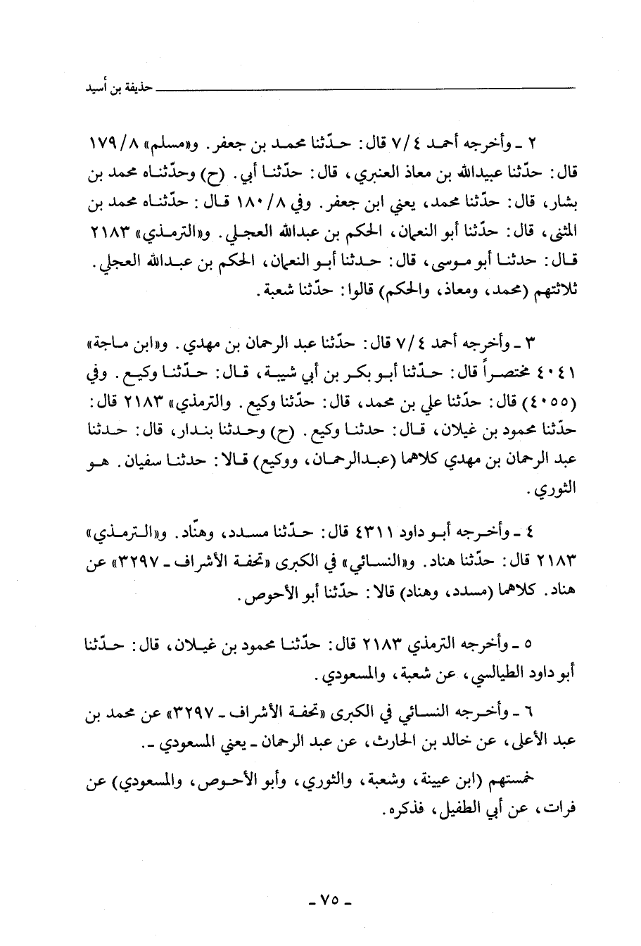 وفي ٤/ ٧ (١٦٢٤٢) قال: حدَّثنا مُحَمَّد بن جَعْفَر، قال: حدَّثنا شُعْبة. وفي (١٦٢٤٤) قال: حدَّثنا عَبْد الرَّحْمان بن مَهْدِي، حدَّثنا سُفْيان. و"مسلم" ٨/ ١٧٨ (٧٣٨٨) قال: حدَّثنا أبو خَيْثَمَة، زُهَيْر بن حَرْب، وإِسْحَاق بن إبراهيم، وابن أَبي عُمَر المَكِّي. قال إِسْحَاق: أخبرنا، وقال الآخران: حدَّثنا سُفْيان بن عُيَيْنَة. وفي ٨/ ١٧٩ (٧٣٨٩) قال: حدَّثنا عُبَيْد اللهِ بن مُعَاذ العَنْبَرِي، حدَّثنا أَبي، حدَّثنا شُعْبة. وفي ٨/ ١٨٠ (٧٣٩١) قال: وحدَّثناه مُحَمَّد بن بَشَّار، حدَّثنا مُحَمَّد، يَعْنِي ابن جَعْفَر، حدَّثنا شُعْبة. وفي (٧٣٩٣) قال: وحدَّثناه مُحَمَّد بن المُثَنَّى، حدَّثنا أبو النُّعْمَان، الحَكَم بن عَبْد اللهِ العِجْلِي، حدَّثنا شُعْبة. و"أبو داود" ٤٣١١ قال: حدَّثنا مُسَدَّد، وهَنَّاد، المَعْنَى، قال مُسَدَّد: حدَّثنا أبو الأَحْوَص. و"ابن ماجة" ٤٠٤١ قال: حدَّثنا أبو بَكْر بن أَبي شَيْبَة، حدَّثنا وَكِيع، عن سُفْيان. وفي (٤٠٥٥) قال: حدَّثنا علي بن مُحَمَّد، حدَّثنا وَكِيع، حدَّثنا سُفْيان. والتِّرْمِذِيّ" ٢١٨٣ قال: حدَّثنا بُنْدَار، حدَّثنا عَبْد الرَّحْمان بن مَهْدِي، حدَّثنا سُفْيان (ح) وحدَّثنا محمود بن غَيْلَان، حدَّثنا وَكِيع، عن سُفْيان (ح) وحدَّثنا هَنَّاد، حدَّثنا أبو الأَحْوَص (ح) وحدَّثنا محمود بن غَيْلَان، حدَّثنا أبو داود الطَّيَالِسِي، عن شُعْبة، والمَسْعُودِي (ح) وحدَّثنا أبو مُوسَى، مُحَمَّد بن المُثَنَّى، حدَّثنا أبو النُّعْمَان، الحَكَم بن عَبْد اللهِ العِجْلِي، عن شُعْبة. و"النَّسائي"، في "الكبرى" ١١٣١٦ قال: أخبرنا هَنَّاد بن السَّرِي، عن أَبي الأَحْوَص. وفي (١١٤١٨) قال: أخبرنا مُحَمَّد بن عَبْد