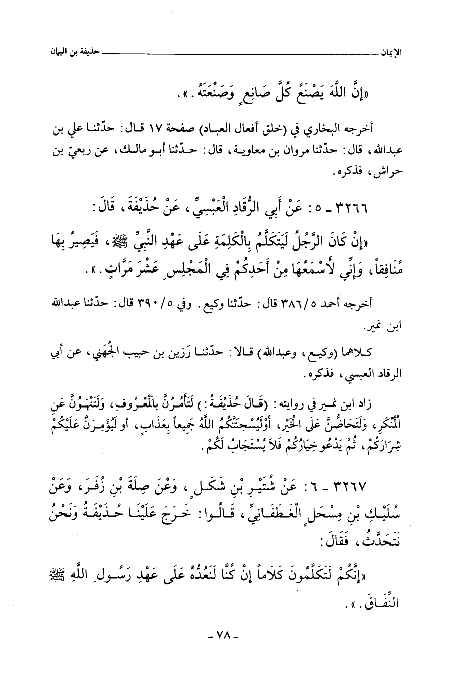 أخرجه البُخَارِي، في (خلق أفعال العباد) ١٧ قال: حدَّثنا على بن عَبْد اللهِ، قال: حدَّثنا مَرْوَان بن مُعَاوِيَة، قال: حدَّثنا أبو مالك، عن رِبْعِي بن حِرَاش، فذكره.