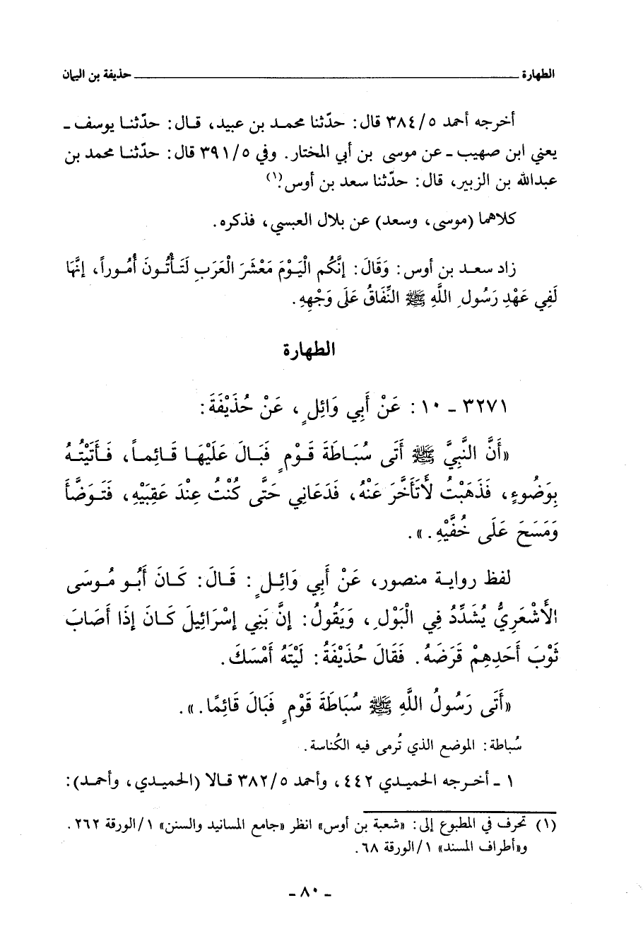 - وفي رواية: عَنْ أَبِي وَائِلٍ، قَالَ: كَانَ أَبُو مُوسَى الأَشْعَرِيُّ يُشَدِّدُ فِي الْبَوْلِ، وَيَقُولُ: إِنَّ بَنِي إِسْرَائِيلَ كَانَ إِذَا أَصَابَ ثَوْبَ أَحَدِهِمْ قَرَضَهُ. فَقَالَ حُذَيْفَةُ: لَيْتَهُ أَمْسَكَ، أَتَى رَسُولُ اللهِ صلى الله عليه وسلم سُبَاطَةَ قَوْمٍ، فَبَالَ قَائِمًا.