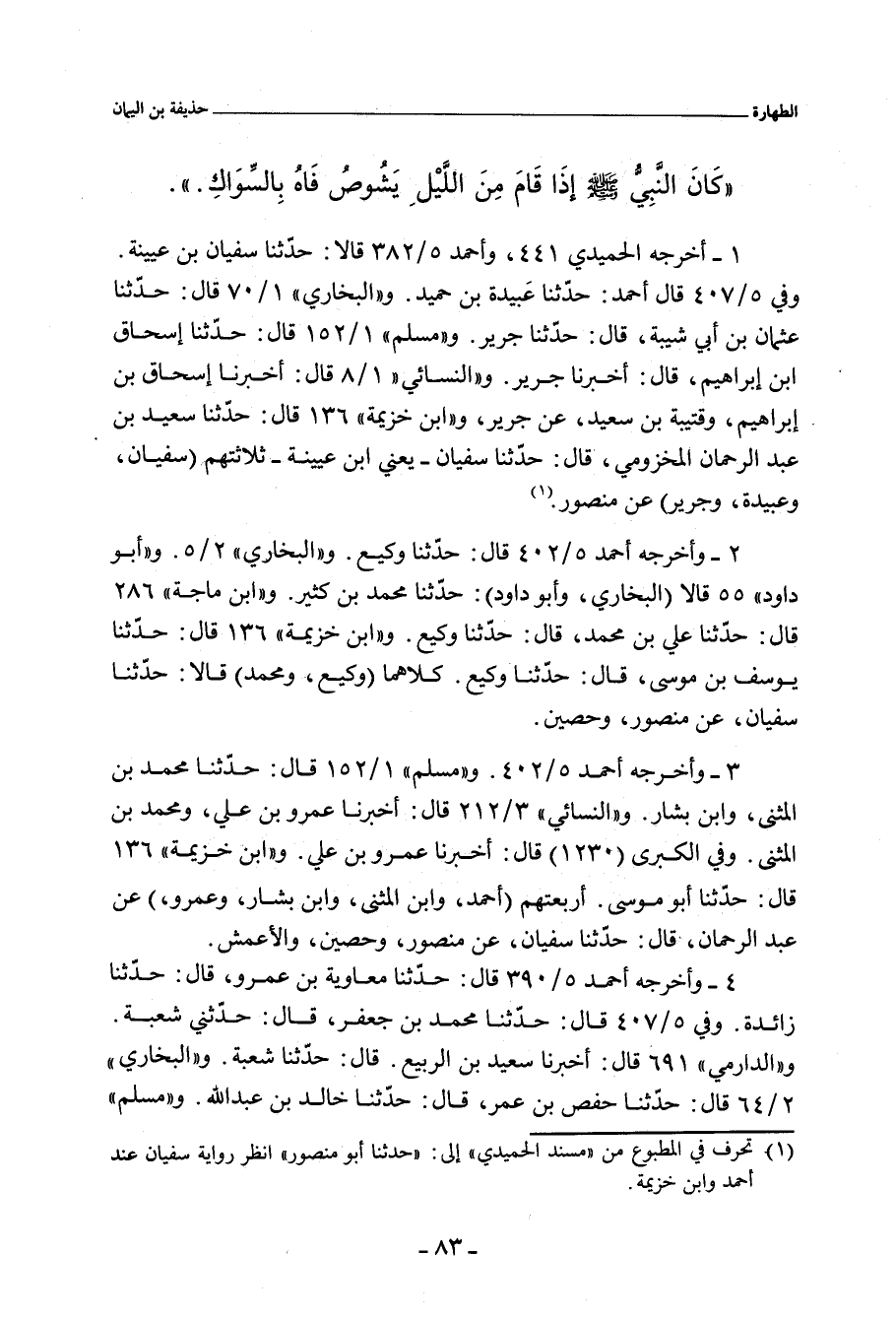 مَنْصُور، وحُصَيْن. و"ابن ماجة" ٢٨٦ قال: حدَّثنا مُحَمَّد بن عَبْد اللهِ بن نُمَيْر، حدَّثنا أبو مُعَاوِيَة، وأَبي، عن الأَعْمَش (ح) وحدَّثنا علي بن مُحَمَّد، حدَّثنا وَكِيع، عن سُفْيان، عن مَنْصُور، وحُصَيْن. و"النَّسائي" ١/ ٨، وفي "الكبرى" ٢ قال: أخبرنا إِسْحَاق بن إبراهيم، وقُتَيْبَة بن سَعِيد، عن جَرِير، عن مَنْصُور. وفي ٣/ ٢١٢ قال: أخبرنا عَمْرو بن علي، ومُحَمَّد بن المُثَنَّى، عن عَبْد الرَّحْمان، عن سُفْيان، عن مَنْصُور، والأَعْمَش، وحُصَيْن. وفي ٣/ ٢١٢ قال: حدَّثنا مُحَمَّد بن عَبْد الأَعْلَى، قال: حدَّثنا خالد، قال: حدَّثنا شُعْبة، عن حُصَيْن. وفي "الكبرى" ١٣٢٣ قال: أخبرنا عَمْرو بن علي، عن عَبْد الرَّحْمان، عن سُفْيان، عن مَنْصُور، والأَعْمَش، وحُصَيْن. و"ابن خزيمة" ١٣٦ و ١١٤٩ قال: حدَّثنا أبو حُصَيْن بن أحمد بن يُونُس، حدَّثنا عَبْثَر، يَعْنِي ابن القاسم، حدَّثنا حُصَيْن (ح) وحدَّثنا علي بن المُنْذِر، وهارون بن إِسْحَاق، قالا: حدَّثنا ابن فُضَيْل. قال علي: قال: حدَّثنا حُصَيْن بن عَبْد الرَّحْمان.