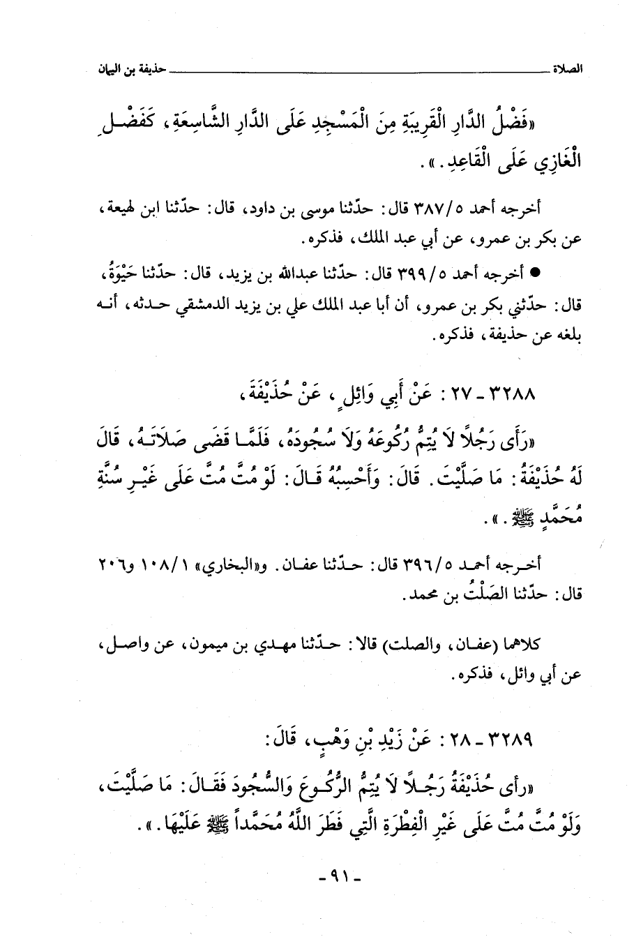 رَأَى رَجُلاً لَا يُتِمُّ رُكُوعَهُ وَلَا سُجُودَهُ، فَلَمَّا قَضَى صَلَاتَهُ، قَالَ لَهُ حُذَيْفَةُ: مَا صَلَّيْتَ. قَالَ: وَأَحْسِبُهُ قَالَ: وَلَوْ مُتَّ مُتَّ عَلَى غَيْرِ سُنَّةِ مُحَمَّدٍ صلى الله عليه وسلم.