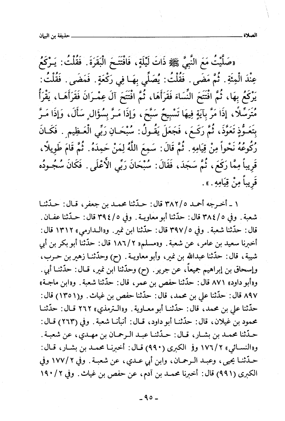 صَلَّيْتُ مَعَ النَّبِيِّ صلى الله عليه وسلم ذَاتَ لَيْلَةٍ، فَافْتَتَحَ الْبَقَرَةَ. فَقُلْتُ: يَرْكَعُ عِنْدَ الْمِئَةِ، ثُمَّ مَضَى. فَقُلْتُ: يُصَلِّي بِهَا فِي رَكْعَةٍ، فَمَضَى. فَقُلْتُ: يَرْكَعُ بِهَا، ثُمَّ افْتَتَحَ النِّسَاءَ فَقَرَأَهَا، ثُمَّ افْتَتَحَ آلَ عِمْرَانَ فَقَرَأَهَا، يَقْرَأُ مُتَرَسِّلاً، إِذَا مَرَّ بِآيَةٍ فِيهَا تَسْبِيحٌ سَبَّحَ، وَإِذَا مَرَّ بِسُؤَالٍ سَأَلَ، وَإِذَا مَرَّ بِتَعَوُّذٍ تعَوَّذَ، ثُمَّ رَكَعَ، فَجَعَلَ يَقُولُ: سُبْحَانَ رَبِّي الْعَظِيمِ، فَكَانَ رُكُوعُهُ نَحْوًا مِنْ قِيَامِهِ، ثُمَّ قَالَ: سَمِعَ اللَّهُ لِمَنْ حَمِدَهُ، ثُمَّ قَامَ طَوِيلاً، قَرِيبًا مِمَّا رَكَعَ، ثُمَّ سَجَدَ، فَقَالَ: سُبْحَانَ رَبِّيَ الأَعْلَى، فَكانَ سُجُودُه قَرِيبًا مِنْ قِيَامِهِ.
