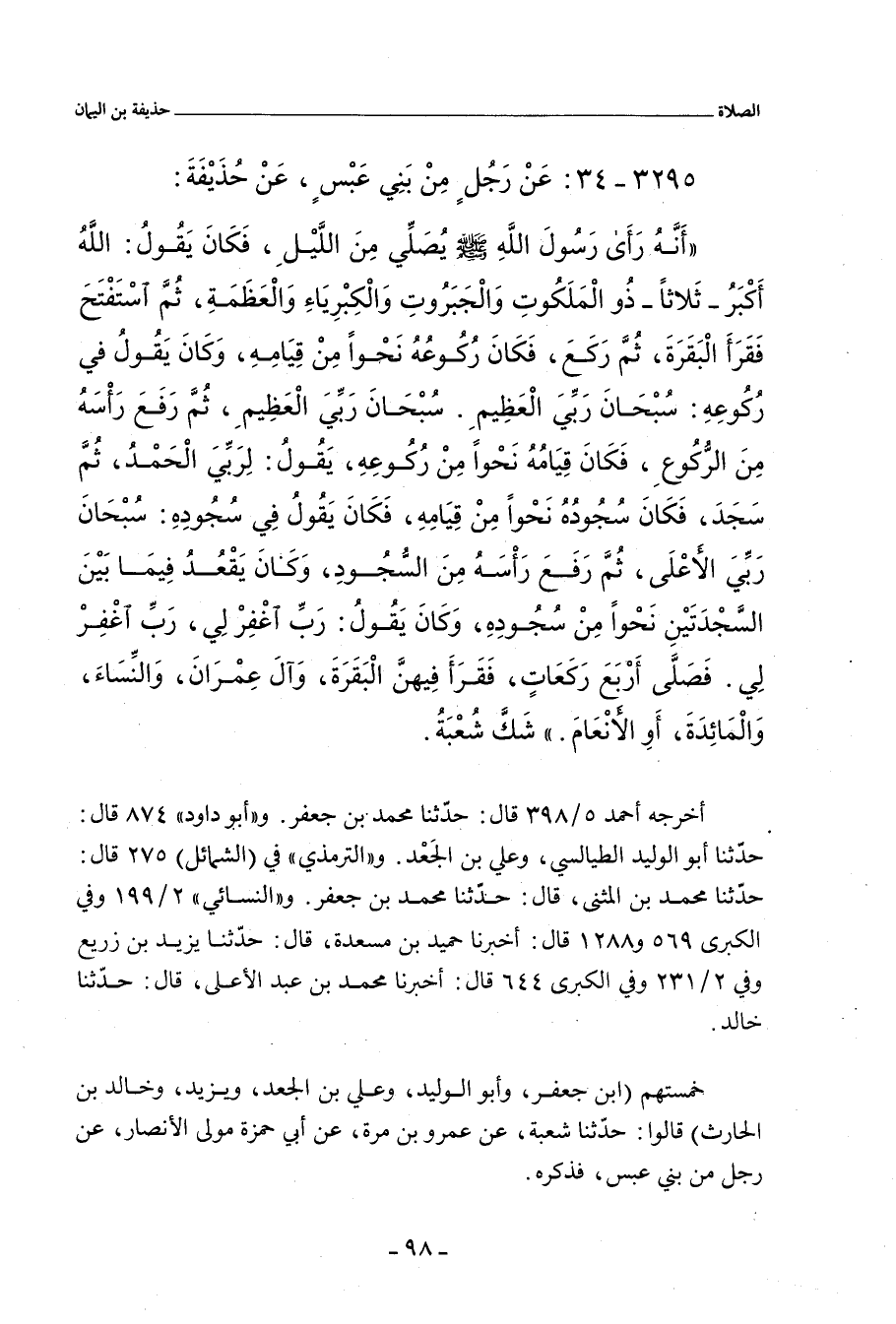 أَنَّهُ رَأَى رَسُولَ اللهِ صلى الله عليه وسلم يُصَلِّي مِنَ اللَّيْلِ، فَكَانَ يَقُولُ: اللَّهُ أَكْبَرُ - ثَلَاثًا - ذُو الْمَلَكُوتِ، وَالْجَبَرُوتِ، وَالْكِبْرِيَاءِ، وَالْعَظَمَةِ، ثُمَّ اسْتَفْتَحَ فَقَرَأَ الْبَقَرَةَ، ثُمَّ رَكَعَ، فَكَانَ رُكُوعُهُ نَحْوًا مِنْ قِيَامِهِ، وَكَانَ يَقُولُ في رُكُوعِهِ: سُبْحَانَ رَبِّيَ الْعَظِيمِ. سُبْحَانَ رَبِّيَ الْعَظِيمِ، ثُمَّ رَفَعَ رَأْسَهُ مِنَ الرُّكُوعِ، فَكَانَ قِيَامُهُ نَحْوًا مِنْ رُكُوعِهِ، يَقولُ: لِرَبِّيَ الْحَمْدُ، ثُمَّ سَجَدَ، فَكَانَ سُجُودُهُ نَحْوًا مِنْ قِيَامِهِ، فَكَانَ يَقُولُ فِي سُجُودِهِ: سُبْحَانَ رَبِّيَ الأَعْلَى، ثُمَّ رَفَعَ رَأْسَهُ مِنَ السُّجُودِ، وَكَانَ يَقْعُدُ فِيمَا بَيْنَ السَّجْدَتَيْنِ نَحْوًا مِنْ سُجُودِهِ، وَكَانَ يَقُولُ: رَبِّ اغْفِرْ لِي، رَبِّ اغْفِرْ لِي. فَصَلَّى أَرْبَعَ رَكَعَاتٍ، فَقَرَأَ فِيهِنَّ الْبَقَرَةَ، وآلَ عِمْرَانَ، وَالنِّسَاءَ، وَالْمَائِدَةَ، أَوِ الأَنْعَامَ - شَكَّ شُعْبَةُ -.