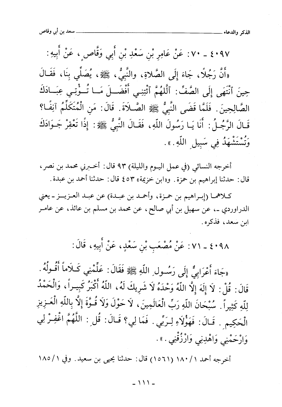 جَاءَ أَعْرَابِىٌّ إِلَى رَسُولِ اللهِ صلى الله عليه وسلم. فَقَالَ: عَلِّمْنِى كَلَامًا أَقُولُهُ. قَالَ: قُلْ: لَا إِلَهَ إِلَاّ اللهُ وَحْدَهُ لَا شَرِيكَ لَهُ، اللهُ أَكْبَرُ كَبِيرًا، وَالْحَمْدُ لِلَّهِ كَثِيرًا، سُبْحَانَ اللهِ رَبِّ الْعَالَمِينَ، لَا حَوْلَ وَلَا قُوَّةَ إِلَاّ بِاللَّهِ الْعَزِيزِ الْحَكِيمِ. قَالَ: فَهَؤُلَاءِ لِرَبِّى. فَمَا لِى؟ قَالَ: قُلِ: اللَّهُمَّ اغْفِرْ لِى وَارْحَمْنِى وَاهْدِنِى وَارْزُقْنِى.