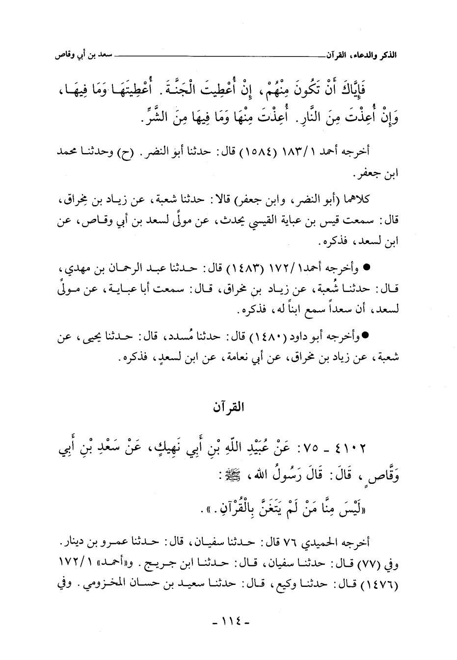كلاهما (أبو النضر، وابن جعفر) قالا: حدثنا شُعْبة، عن زياد بن مِخراق، قال: سمعتُ قَيس بن عَبَاية القَيسي يُحدّث، عن مَولى لسعد بن أَبي وَقاص، عَنِ ابنٍ لِسعد، أنهُ كَانَ يصلي , فَكَانَ يَقُولُ فِي دُعَائه: اللهم إني أَسأَلُكَ اَلْجَنةَ، وَأَساَلُكَ مِن نَعِيمِهَا وَبهجَتِهَا، وَمِن كَذَا، ومِن كَذَا، وَمِن كَذَا، وَمِنْ كَذَا، وَأَعُوذُ بِكَ مِنَ النارِ، وَسَلَاسِلِهَا، وَأَغلَالِهَا، وَمِن كَذَا وَمِن كَذَا، قَالَ: فَسَكَتَ عَنهُ سعد، فَلَمَّا صَلى، قَالَ لَهُ سعد: تَعَوَّذْتَ مِن شَرِّ عَظِيم، وسألت نَعِيما عَظِيما، أَو قَالَ طَوِيلا، (شُعبَةُ شَك) قَالَ رَسُولُ الله صلى الله عليه وسلم: