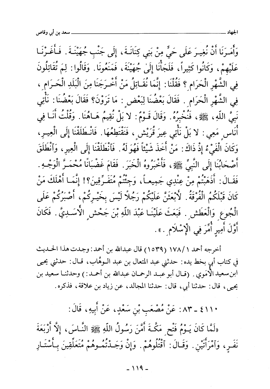 وَأَمَرَنَا أَنْ نُغِيرَ عَلَى حَىٍّ مِنْ بَنِى كِنَانَةَ، إِلَى جَنْبِ جُهَيْنَةَ، فَأَغَرْنَا عَلَيْهِمْ، وَكَانُوا كَثِيرًا، فَلَجَأْنَا إِلَى جُهَيْنَةَ، فَمَنَعُونَا. وَقَالُوا: لِمَ تُقَاتِلُونَ فِى الشَّهْرِ الْحَرَامِ؟ فَقُلْنَا إِنَّمَا نُقَاتِلُ مَنْ أَخْرَجَنَا مِنَ الْبَلَدِ الْحَرَامِ، فِى الشَّهْرِ الْحَرَامِ، فَقَالَ بَعْضُنَا لِبَعْضٍ: مَا تَرَوْنَ؟ فَقَالَ بَعْضُنَا: نَأْتِى نَبِىَّ اللهِ، صلى الله عليه وسلم، فَنُخْبِرُهُ، وَقَالَ قَوْمٌ: لَا بَلْ نُقِيمُ هَا هُنَا، وَقُلْتُ أَنَا، فِى أُنَاسٍ مَعِى: لَا بَلْ نَأْتِى عِيرَ قُرَيْشٍ، فَنَقْتَطِعُهَا، فَانْطَلَقْنَا إِلَى الْعِيرِ، وَكَانَ الْفَىْءُ إِذْ ذَاكَ؛ مَنْ أَخَذَ شَيْئًا فَهُوَ لَهُ، فَانْطَلَقْنَا إِلَى الْعِيرِ، وَانْطَلَقَ أَصْحَابُنَا إِلَى النَّبِىِّ صلى الله عليه وسلم، فَأَخْبَرُوهُ الْخَبَرَ، فَقَامَ غَضْبَانًا مُحْمَرَّ الْوَجْهِ. فَقَالَ: أَذَهَبْتُمْ مِنْ عِنْدِى جَمِيعًا، وَجِئْتُمْ مُتَفَرِّقِينَ؟! إِنَّمَا أَهْلَكَ مَنْ كَانَ قَبْلَكُمُ الْفُرْقَةُ، لأَبْعَثَنَّ عَلَيْكُمْ رَجُلاً لَيْسَ بِخَيْرِكُمْ، أَصْبَرُكُمْ عَلَى الْجُوعِ وَالْعَطَشِ، فَبَعَثَ عَلَيْنَا عَبْدَ اللهِ بْنَ جَحْشٍ الأَسَدِىَّ، فَكَانَ أَوَّلَ أَمِيرٍ أُمِّرَ فِى الإِسْلَامِ.
