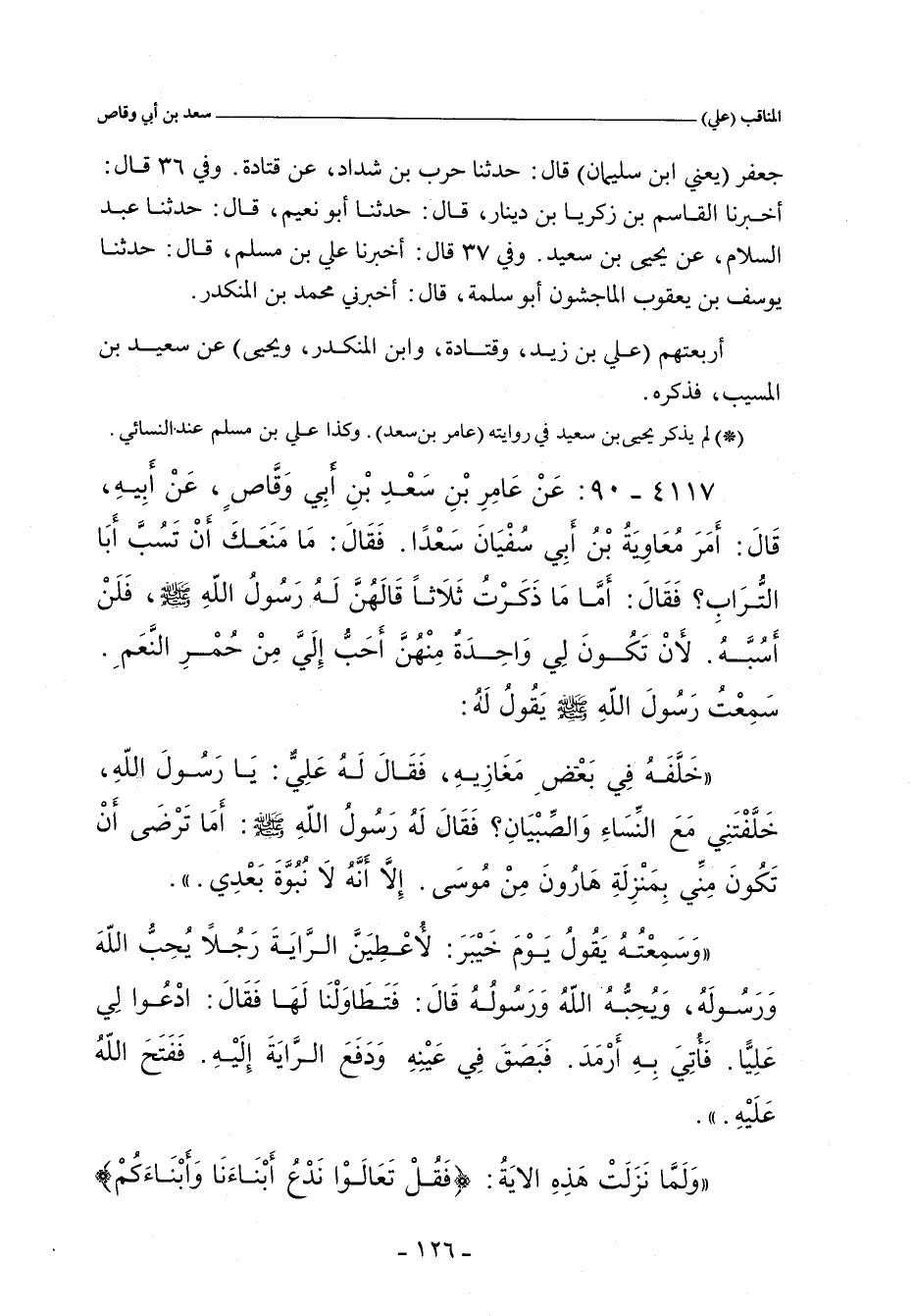 ٤١١٧ - عَنْ عَامِرِ بْنِ سَعْدٍ بن أبي وقاص , عَنْ أَبِيهِ , قَالَ: أمر معاوية بن سفيان سعدا. فقال: ما منعك أن تسب أبا التراب؟ فقال: أما ما ذكرت ثلاثا قالهن له رَسُولَ اللهِ صلى الله عليه وسلم فلن أسبه , لأن تكون لي واحدة منهن أحب إلي من حمر النعم , سمعت رسول الله صلى الله عليه وسلم يَقُولُ لَهُ: خَلَّفَهُ فِى بَعْضِ مَغَازِيهِ , فَقَالَ عَلِىٌّ: يا رسول الله , ُخَلِّفتُنِي مَعَ النِّسَاءِ وَالصِّبْيَانِ؟ فقَالَ له رسول الله صلى الله عليه وسلم: أَمَا تَرْضَى أَنْ تَكُونَ مِنِّى بِمَنْزِلَةِ هَارُونَ مِنْ مُوسَى , إِلَاّ أَنَّهُ لَا نُبُوَّةَ بَعْدِى. وَسَمِعْتُهُ يَقُولُ يَوْمَ خَيْبَرَ: لأُعْطِيَنَّ الرَّايَةَ رَجُلاً يُحِبُّ اللَّهَ وَرَسُولَهُ وَيُحِبُّهُ اللهُ وَرَسُولُهُ. قال: فَتَطَاوَلْنَا لَهَا. فَقَالَ: ادْعُوا لِى عَلِيًّا , فَأُتِىَ بِهِ أَرْمَدَ , فَبَصَقَ فِى عَيْنِهِ , وَدَفَعَ الرَّايَةَ إِلَيْهِ , فَفَتَحَ اللهُ عَلَيْهِ. وَلَمَّا نَزَلَتْ هَذِهِ الآيَةُ (فقل تعالو نَدْعُ أَبْنَاءَنَا وَأَبْنَاءَكُمْ)