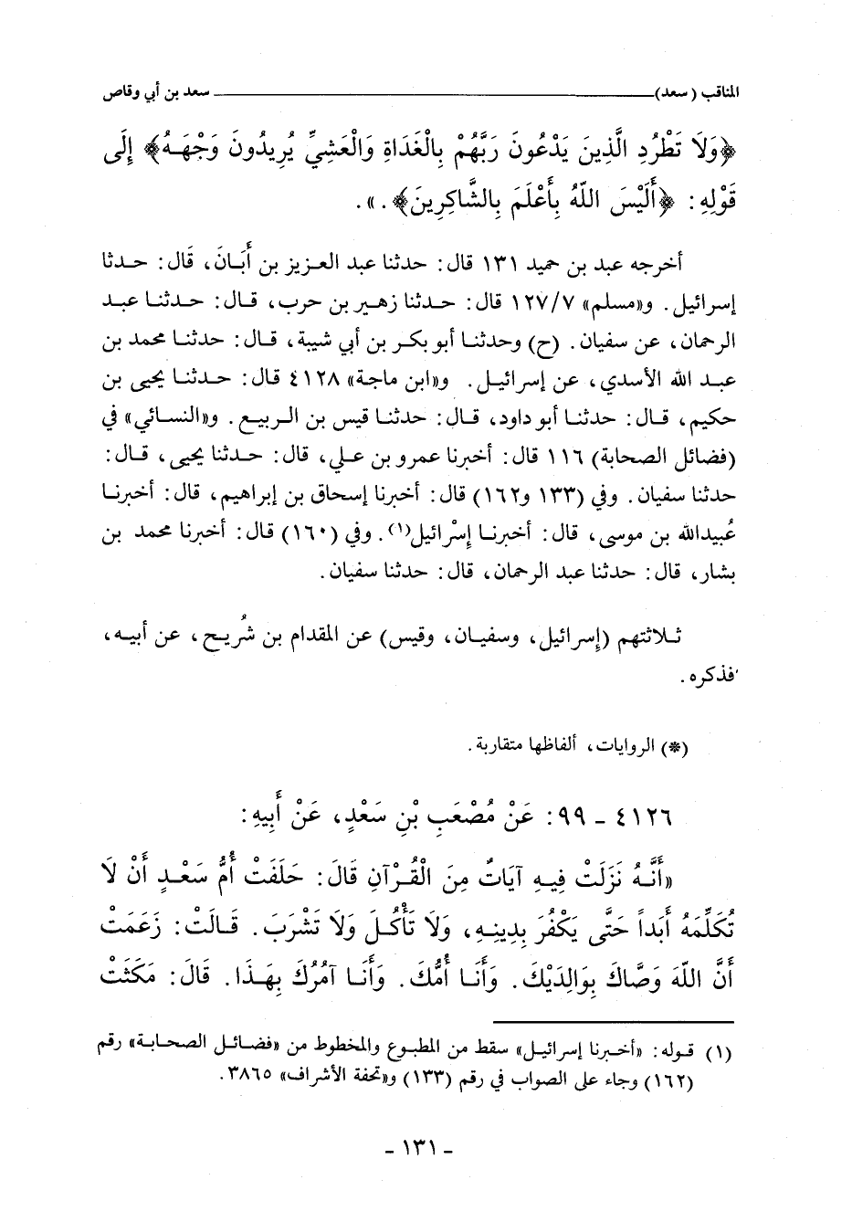 - وفي رواية: كُنُّا مَعَ ألنبِي صلى الله عليه وسلم سِتَّةَ نَفَرٍ، فَقَالَ اَلْمُشْرِكُونَ لِنبِي صلى الله عليه وسلم: أطرُدْ هَؤُلَاءِ لَا يَجْتَرِؤُونَ عَلَيْنَا. قَالَ: وَكُتتُ أَنَا وَاَبنُ مَسعُودٍ، وَرَجُل مِنْ هُذَيْلٍ، وَبِلَال، وَرَجُلَانِ لَسْتُ أُسَميهِمَا، فَوَقَعَ فِي نَفْسِ رَسُولِ الله مصلى الله عليه وسلم مَا شَاءَ أَنْ يَقَعَ، فَحَدثَ نَقسَهُ، فَأَنْرَلَ الله عَز وَجَل: (ولاتَطرد اَلَّذِينَ يَدعُونَ رَبَّهُم بِاَلغَدوةَ وَاَلعشيِ يرِيدونَ وَجَة).