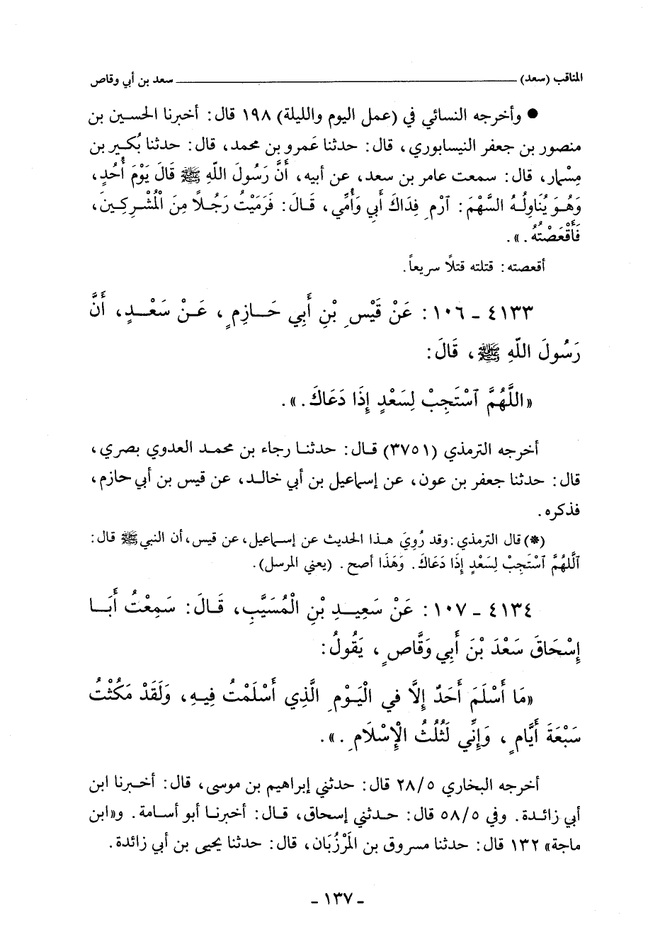 ٤١٣٤ - عن سَعِيدَ بْنَ الْمُسَيَّبِ , قال: سمعت أبا إسحاق سعد بن أبي وقاص , يَقُولُ: