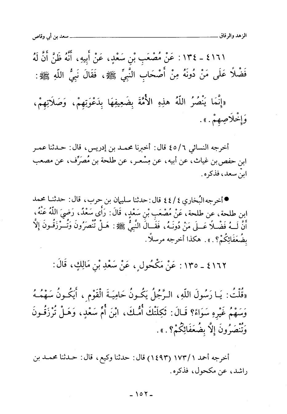 - أخرجه البُخاري ٤/ ٤٤ (٢٨٩٦) قال: حدثنا سُلَيْمَان بن حَرب، حدثنا محمد بن طَلحة، عن طَلحة، عَن مُصعَبِ بن سَعد، َ ضِيَ الله عَنهُ، أَن لَهُ فَضلا على مَن دُونَهُ، فَقَالَ النبي صلى الله عليه وسلم: