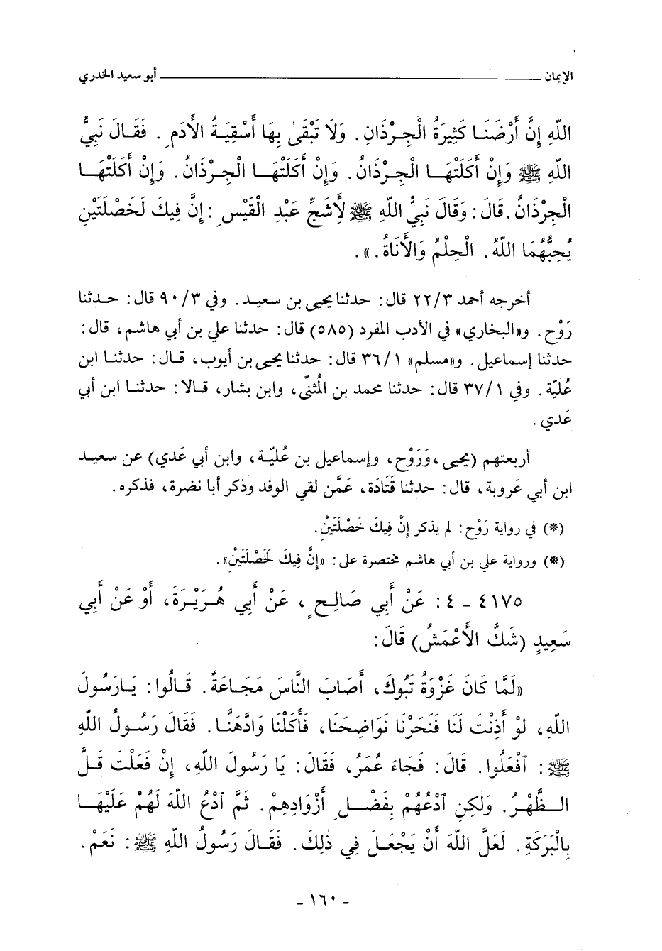- وفي رواية: قَالَ النَبِيُّ صلى الله عليه وسلم لأَشَجِّ عَبْدِ الْقَيْسِ: إِنَّ فِيكَ لَخَصْلَتَيْنِ يُحِبُّهُمَا اللهُ: الْحِلْمُ وَالأَنَاةُ. مُخْتَصَرٌ.