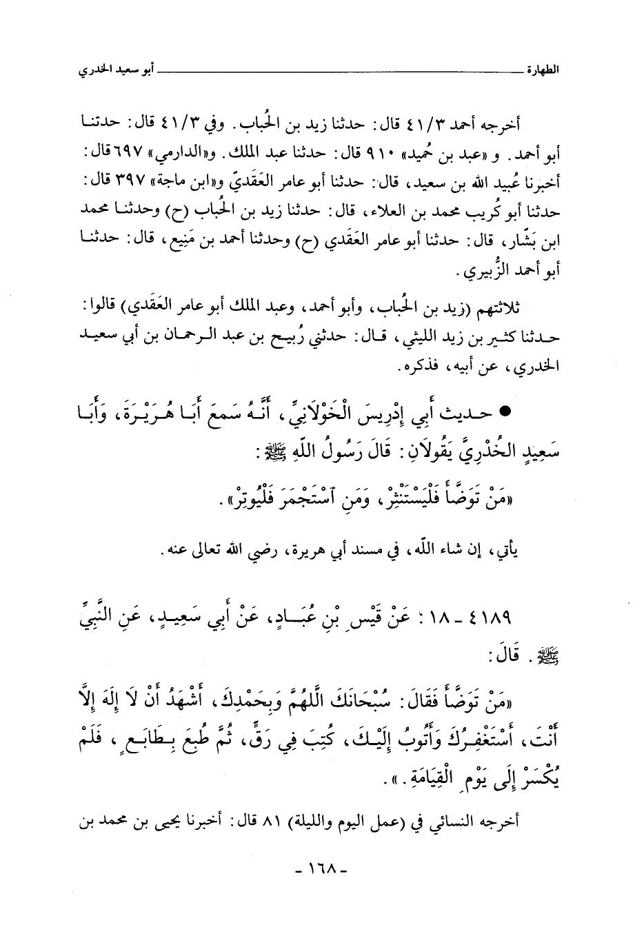 ثلاثتهم (زَيْد بن الحُبَاب، ومُحَمد بن عَبْد اللهِ، أبو أحمد الزُّبَيْري، وعَبْد الملك أبو عامر العَقَدِي) قالوا: حدَّثنا كَثِير بن زَيْد، عن رُبَيْح بن عَبْد الرَّحْمان بن أَبي سَعِيد الخُدْرِي، عن أبيه، فذكره.