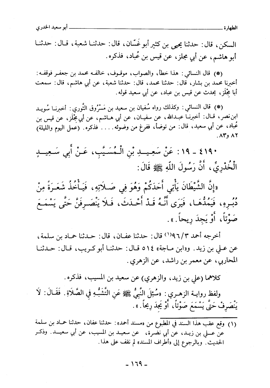 إِنَّ الشَّيْطَانَ يَأْتِي أَحَدَكُمْ، وَهُوَ فِي صَلَاتِهِ، فَيَأْخُذُ شَعْرَةً مِنْ دُبُرِهِ، فَيَمُدُّهَا، فَيَرَى أَنَّهُ قَدْ أَحْدَثَ، فَلَا يَنْصَرِفَنَّ حَتَّى يَسْمَعَ صَوْتًا، أَوْ يَجِدَ رِيحًا.