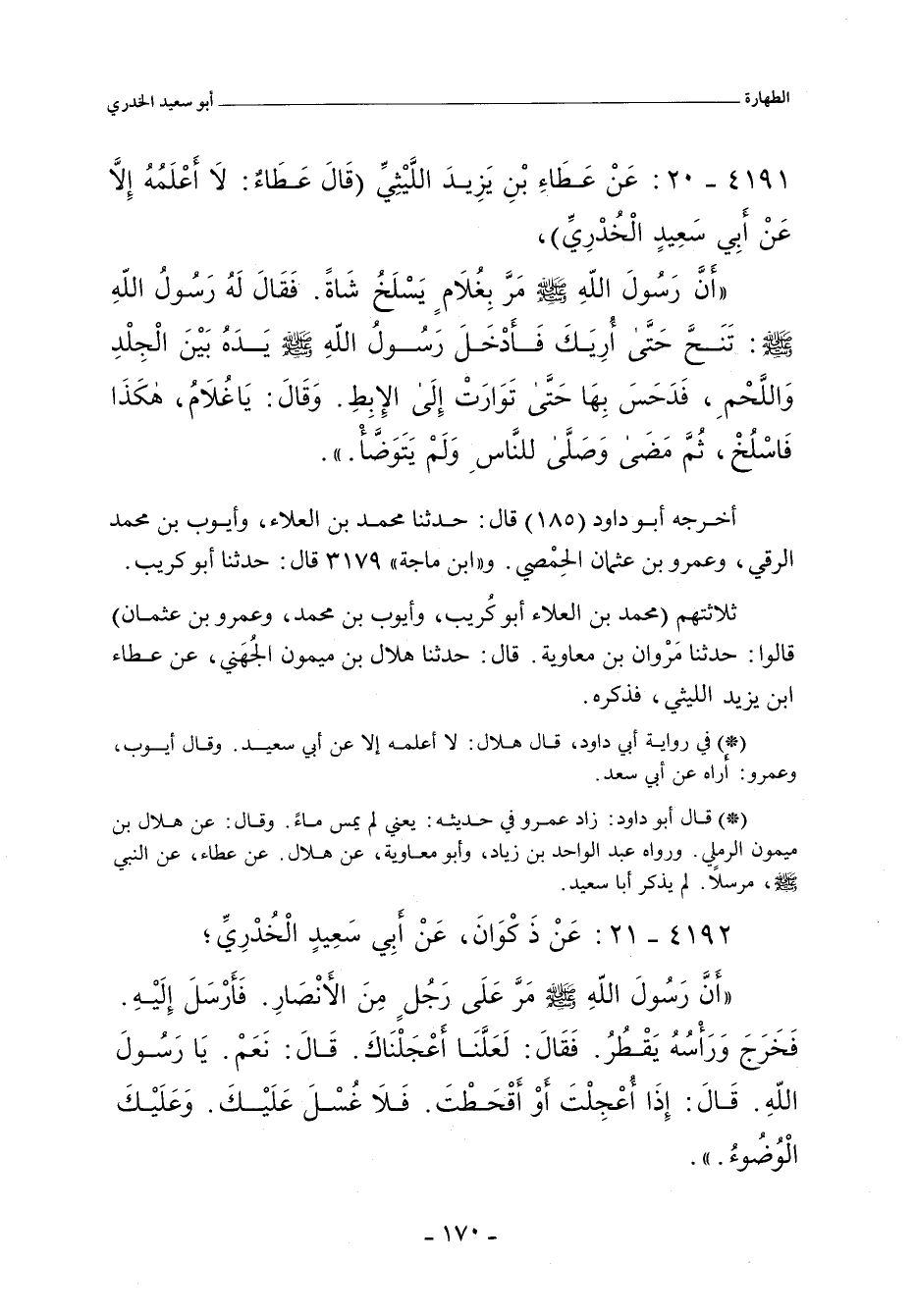 - قال أبو داود: زاد عَمْرو في حديثه: يَعْنِي لم يمس ماءً)، وقال: عن هِلَال بن ميمون الرَّمْلِي، ورواه عَبْد الواحد بن زِيَاد، وأبو مُعَاوِيَة، عن هِلَال، عن عَطَاء، عن النَّبِيّ صلى الله عليه وسلم مرسلاً , لم يذكر أبا سَعِيد.