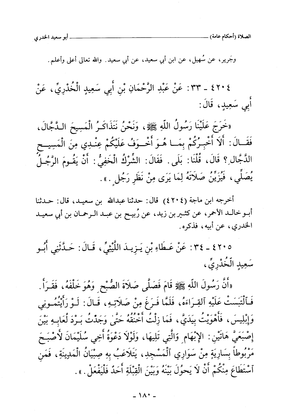 خَرَجَ عَلَيْنَا رَسُولُ اللَّهِ صلى الله عليه وسلم , وَنَحْنُ نَتَذَاكَرُ الْمَسِيحَ الدَّجَّالَ , فَقَالَ: أَلَا أُخْبِرُكُمْ بِمَا هُوَ أَخْوَفُ عَلَيْكُمْ عِنْدِى مِنَ الْمَسِيحِ الدَّجَّالِ؟ قَالَ , قُلْنَا: بَلَى. فَقَالَ: الشِّرْكُ الْخَفِىُّ: أَنْ يَقُومَ الرَّجُلُ يُصَلِّى , فَيُزَيِّنُ صَلَاتَهُ لِمَا يَرَى مِنْ نَظَرِ رَجُلٍ.