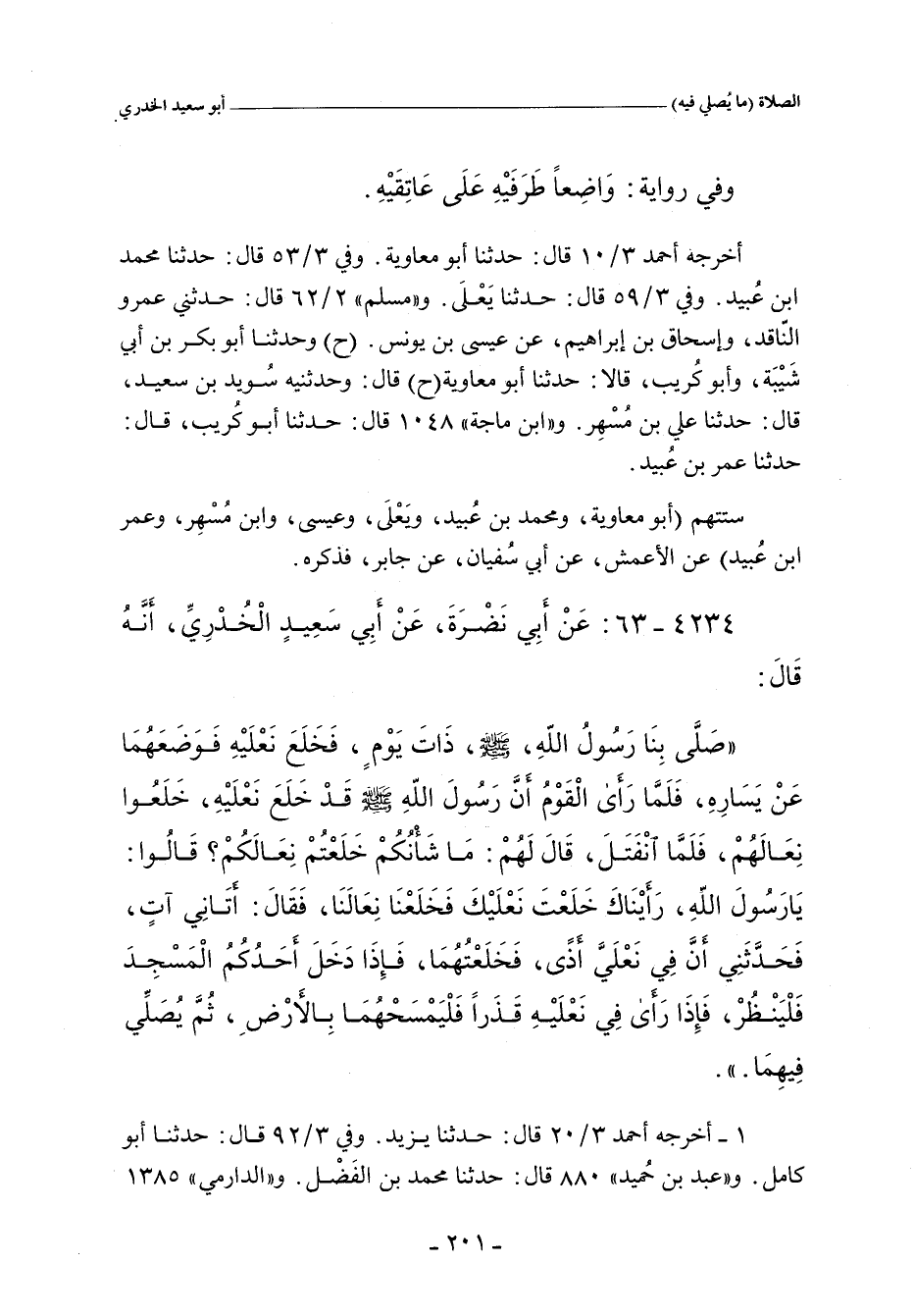 - وفي رواية: بَيْنَمَا رَسُولُ اللهِ صلى الله عليه وسلم يُصَلِّى بِأَصْحَابِهِ، إِذْ خَلَعَ نَعْلَيْهِ، فَوضَعَهُمَا عَنْ يَسَارِهِ، فَلَمَّا رَأَى ذَلِكَ المسلمَوْن أَلْقَوْا نِعَالَهُمْ، فَلَمَّا قَضَى النَّبِيُّ صلى الله عليه وسلم صَلَاتَهُ، قَالَ: مَا حَمَلَكُمْ عَلَى إِلْقَائِكُمْ نِعَالَكُمْ؟ قَالُوا: رَأَيْنَاكَ أَلْقَيْتَ فَأَلْقَيْنَا، فَقَالَ رَسُولُ الله صلى الله عليه وسلم: إِنَّ جِبْرِيلَ، عَلَيْهِ السَّلَامُ، أَتَانِي فَأَخْبَرَنِي أَنَّ فِيهِمَا قَذَرًا، أَوْ أَذًى، فإِذَا جَاءَ أَحَدُكُمُ الْمَسْجِدَ فَلْيَنْظُرْ، فَإِنْ رَأَى فِي نَعْلَهِ قَذَرًا فَلْيَمْسَحْهُ، ثُمَّ لْيُصَلِّ فِيهِمَا.