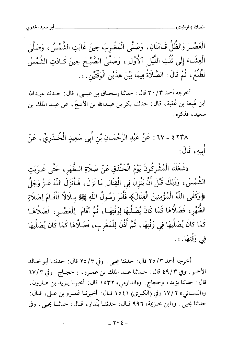شَغَلَنَا الْمُشْرِكُونَ، يَوْمَ الْخَنْدَقِ، عَنْ صَلَاةِ الظُّهْرِ، حَتَّى غَرَبَتِ الشَّمْسُ، وَذَلِكَ قَبْلَ أَنْ يَنْزِلَ فِي الْقِتَالِ مَا نَزَلَ، فَأَنْزَلَ اللهُ، عَزَّ وَجَلَّ: (وَكَفَى اللهُ الْمُؤْمِنِينَ الْقِتَالَ) فَأَمَرَ رَسُولُ اللهِ صلى الله عليه وسلم بِلَالاً فَأَقَامَ لِصَلَاةِ الظُّهْرِ، فَصَلَاّهَا كَمَا كَانَ يُصَلِّيهَا لِوَقْتِهَا، ثُمَّ أَقَامَ لِلْعَصْرِ، فَصَلَاّهَا كَمَا كَانَ يُصَلِّيهَا لِوَقْتِهَا، ثُمَّ أَذَّنَ لِلْمَغْرِبِ، فَصَلَاّهَا كَمَا كَانَ يُصَلِّيهَا لِوَقْتِهَا.