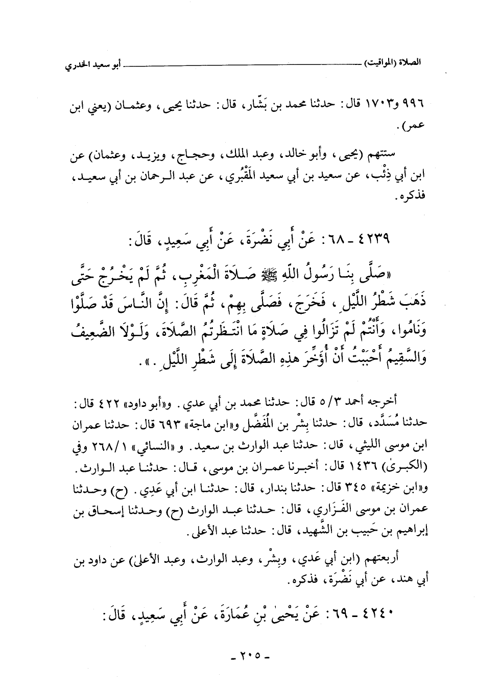 ستتهم (يَحيى , وأبو خالد , وعَبْد الملك , وحَجَّاج , ويزيد , وعُثْمَان) عن ابن أَبي ذِئْب , عن سَعِيد بن أَبي سَعِيد المَقْبُرِي , عن عَبْد الرَّحْمان بن أَبي سَعِيد الخُدْرِي , فذكره.