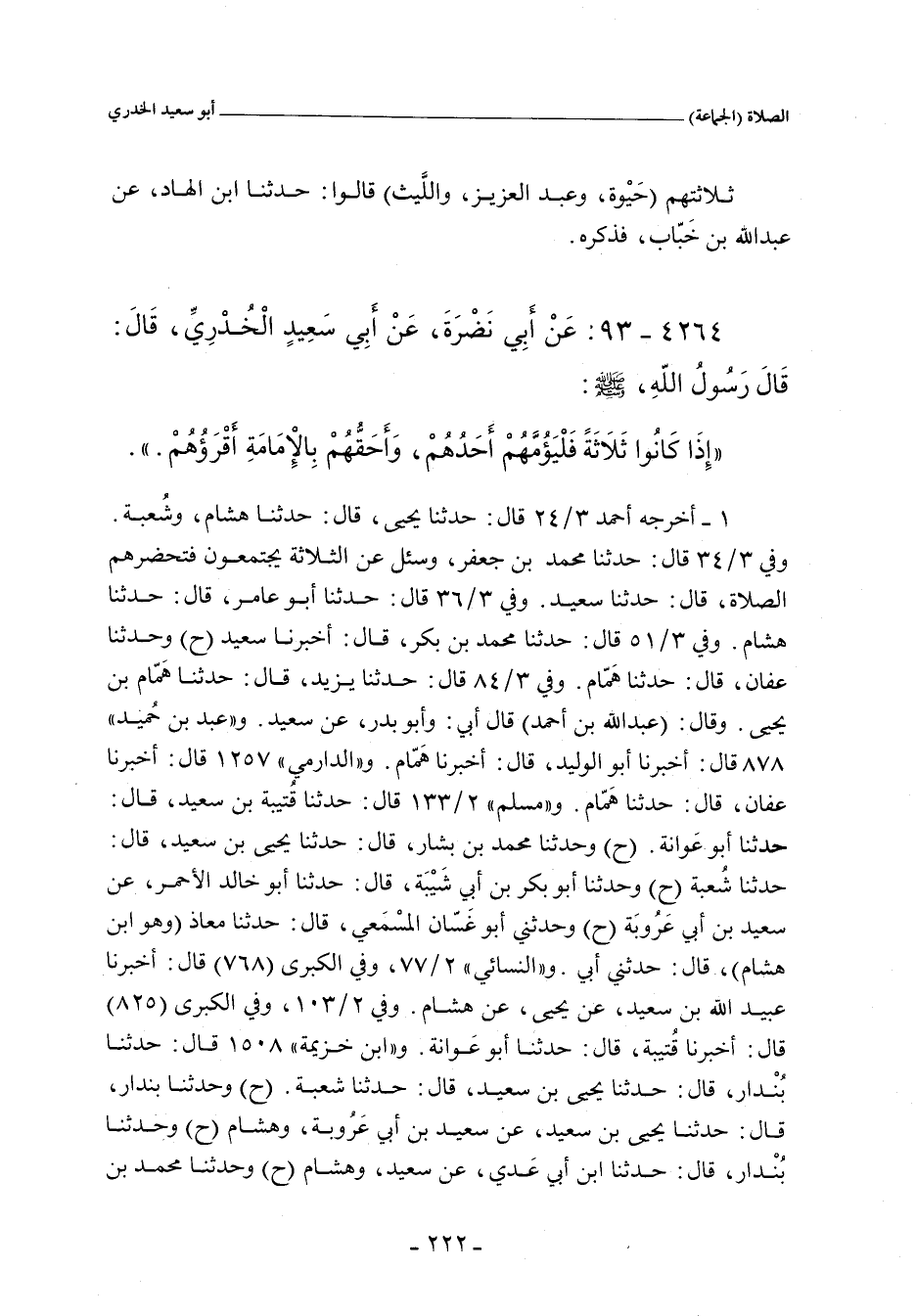 أخرجه أحمد ٣/ ٢٤ (١١٢٠٨) قال: حدَّثنا يَحيى، حدَّثنا هِشَام، وشُعْبة. وفي ٣/ ٣٤ (١١٣١٨) قال: حدَّثنا مُحَمد بن جَعْفَر - وسُئل عن الثلاثة يجتمعون فتحضرهم الصلاة -؟ قال: حدَّثنا سَعِيد. وفي ٣/ ٣٦ (١١٣٣٤) قال: حدَّثنا أبو عامر، حدَّثنا هِشَام. وفي ٣/ ٤٨ (١١٤٧٤) و ٣/ ٨٤ (١١٨١٧) قال: حدَّثنا يَزِيد، حدَّثنا هَمَّام بن يَحيى (ح) وأبو بَدْر، عن سَعِيد. وفي ٣/ ٥١ (١١٥٠١) قال: حدَّثنا مُحَمد بن بَكْر، أنبأنا سَعِيد (ح) وحدَّثنا عَفَّان، حدَّثنا هَمَّام. و"عَبد بن حُميد" ٨٧٨ قال: أخبرنا أبو الوَلِيد، أخبرنا هَمَّام. و"الدارِمِي" ١٢٥٤ قال: أخبرنا عَفَّان، حدَّثنا هَمَّام. و"مسلم" ٢/ ١٣٣ (١٤٧٤) قال: حدَّثنا قُتَيْبَة بن سَعِيد، حدَّثنا أبو عَوَانَة. وفي (١٤٧٥) قال: حدَّثنا مُحَمد بن بَشَّار، حدَّثنا يَحيى بن سَعِيد، حدَّثنا شُعْبة (ح) وحدَّثنا أبو بَكْر بن أَبي شَيْبَة، حدَّثنا أبو خالد الأَحْمَر، عن سَعِيد بن أَبي عَرُوبَة (ح) وحدَّثني أبو غَسَّان المِسْمَعِي، حدَّثنا مُعَاذ، وهو ابن هِشَام، حدَّثني أَبي. و"النَّسائي" ٢/ ٧٧، وفي "الكبرى" ٨٥٩ قال: أخبرنا عُبَيْد اللهِ بن سَعِيد، عن يَحيى، عن هِشَام. وفي ٢/ ١٠٣، وفي "الكبرى" ٩١٦ قال: أخبرنا قُتَيْبَة، قال: حدَّثنا أبو عَوَانَة. و"ابن خزيمة" ١٥٠٨ قال: حدَّثنا بُنْدَار، حدَّثنا يَحيى بن سَعِيد، حدَّثنا شُعْبة (ح) وحدَّثنا بُنْدَار، حدَّثنا يَحيى بن سَعِيد، عن سَعِيد بن أَبي عَرُوبَة، وهِشَام (ح)