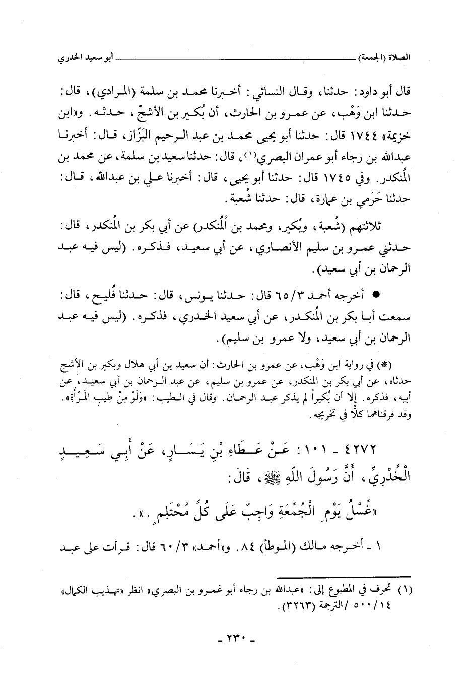 كلاهما (شُعْبة، ومُحَمد بن المُنْكَدِر) عن أَبي بَكْر بن المُنْكَدِر، قال: حدَّثني عَمْرو بن سُلَيْم الأَنْصَارِي، قال: أشهد على أَبي سَعِيدٍ، قال: أشهد على رسُولِ اللهِ صلى الله عليه وسلم، فذكره.