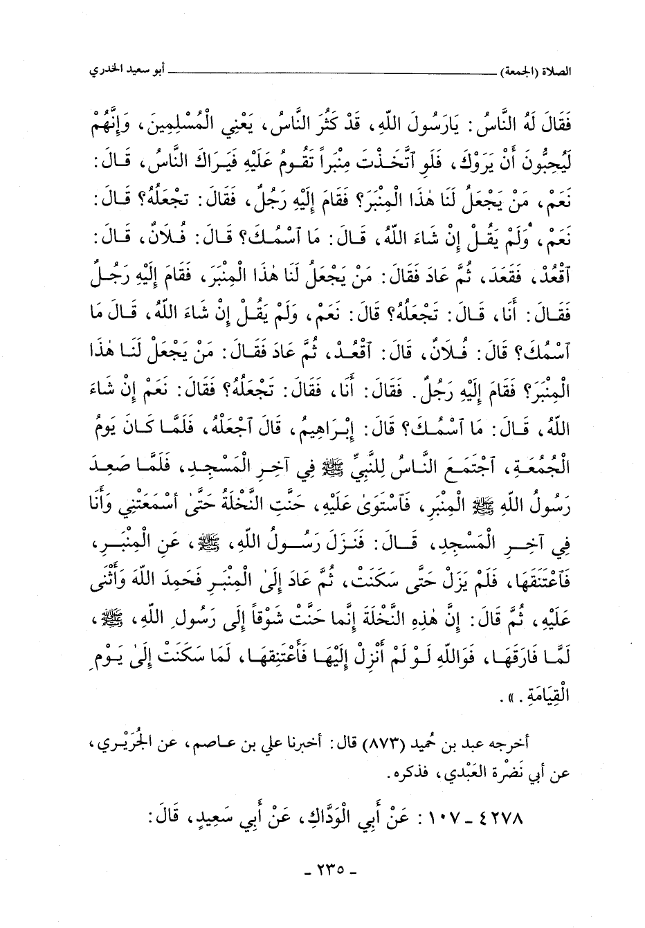 فَقَالَ لَهُ اَلناسُ: يَا رَسُولَ الله، قَدْ كَثُرَ الناسُ، يَعْنِي المُسْلِمِينَ، وَإِنهُمْ لَيُحِبونَ أَنْ يَرَوْكَ، فَلَوِ اتخَذْتَ مِنْبَرًا تَقُومُ عَلَيْهِ فَيَرَاكَ النَّاسُ، قَالَ: نَعَمْ، مَنْ يَجعَلُ لَنَا هذا المِنبَرَ؟ فَقَامَ إِلَيْهِ رَجُل، فَقَالَ: تَجْعَلُهُ؟ قَالَ: نَعَمْ، وَلَمْ يَقُلْ إنْ شَاءَ اللهُ، قَالَ: مَا اسْمُكَ؟ قَالَ: فُلَانٌ، قَالَ: اقعُد، فَقَعَد، ثُم عَادَ فَقَالَ: مَنْ يَجعَلُ لَنَا هذا الْمِنْبَرَ , فقام إليْهِ رَجُل فَقَال. أَنَا، قَالَ: تَجْعَلُهُ؟ قَالَ: نَعَمْ، وَلَمْ يَقُلْ إِنْ شَاءَ الله، قَالَ: مَا اسْمُكَ؟ قَالَ: فُلَان، قَالَ: اقْعُد، ثُمَّ عَادَ فَقَالَ: مَنْ يَجْعَلْ لَنَا هذا الْمِنْبَر؟ فَقَامَ إِلَيْهِ رَجُل. فَقَالَ: أَنَا، فَقَالَ: تَجْعَلُهُ؟ فَقَالَ: نَعَمْ إِنْ شَاءَ الله، قَالَ: مَا اسْمُكَ؟ قَالَ: إبراهيم، قَالَ اجعَلْهُ، فَلَمَّا كَانَ يَومُ الْجُمُعَة، اجْتَمَعَ الناسُ لِلنبِي صلى الله عليه وسلم فِي آخِرِ الْمَسْجِد، فلما صعد رَسُولُ الله صلى الله عليه وسلم المنبر , فَاَسْتَوَى عَليْهِ، حَنت النَّخلة، حَتَّى أسْمَعَتْنِي، وَأنَا فِي آخر الْمَسْجِد، قَالَ: فَنَزَلَ رَسُولُ الله، صلى الله عليه وسلم , عَنِ الْمِنْبَر، فَاعْتَنَقَهَا، فَلَمْ يَزَلْ حَتَّى سَكَنَتْ، ثُمَّ عَادَ إِلَى الْمِنْبَر، فَحَمِدَ الله، وَأَثْنَى عَلَيهِ، ثُم قَالَ: إِن هذِهِ النخلَةَ إِنما حَنَّتْ شَوْقًا إِلَى رَسُولِ الله، صلى الله عليه وسلم، لَما فَارَقَهَا، فَوَاللهِ لَوْ لَم أَنْزِلْ إِلَيْهَا