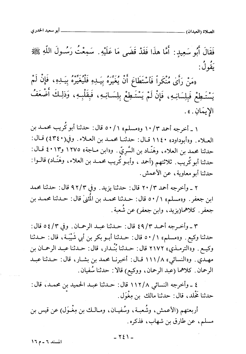 مَنْ رَأَى مُنْكَرًا فَاسْتَطَاعَ أَنْ يُغَيِّرَهُ بِيَدِهِ، فَلْيُغَيِّرْهُ بِيَدِهِ، فَإِنْ لَمْ يَسْتَطِعْ فَبِلِسَانِهِ، فَإِنْ لَمْ يَسْتَطِعْ بِلِسَانِهِ فَبِقَلْبِهِ، وَذَلِكَ أَضْعَفُ الإِيمَانِ.