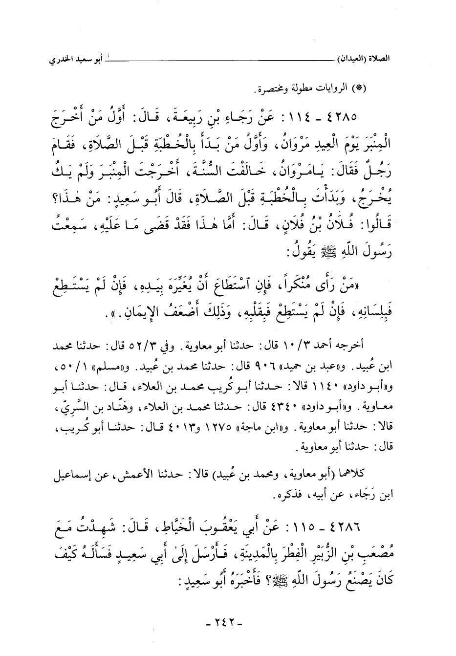٤٢٨٥ - عن رَجَاءٍ بن ربيعة , قَالَ: أَوَّلُ مَنْ أَخْرَج َالْمِنْبَرَ يَوْمَ الْعِيدِ مَرْوَانُ , وَأَوَّلُ مَنْ بَدَأَ بِالْخُطْبَةِ قَبْلَ الصَّلَاةِ , فَقَامَ رَجُلٌ فَقَالَ: يَا مَرْوَانُ , خَالَفْتَ السُّنَّةَ , أَخْرَجْتَ الْمِنْبَرَ وَلَمْ يَكُ يُخْرَجُ , وَبَدَأْتَ بِالْخُطْبَةِ قَبْلَ الصَّلَاةِ , قَالَ أَبُو سَعِيدٍ: مَنْ هَذَا قَالُوا: فُلَانُ بْنُ فُلَانٍ , قَالَ: أَمَّا هَذَا فَقَدْ قَضَى مَا عَلَيْهِ , سَمِعْتُ رَسُولَ اللَّهِ صلى الله عليه وسلم يَقُولُ: