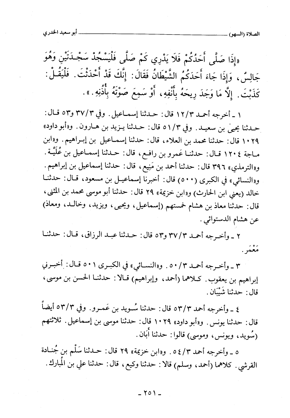 - وفي رواية: إِذَا شَبَّهَ عَلَى أَحَدِكُمُ الشَّيْطَانُ، وَهُوَ فِي صَلَاتِهِ، فَقَالَ: أَحْدَثْتَ، فَلْيَقُلْ فِي نَفْسِهِ: كَذَبْتَ، حَتَّى يَسْمَعَ صَوْتًا بِأُذُنَيْهِ، أَوْ يَجِدَ رِيحًا بِأَنْفِهِ. وَإِذَا صَلَّى أَحَدُكُمْ فَلَمْ يَدْرِ أَزَادَ، أَمْ نَقَصَ، فَلْيَسْجُدْ سَجْدَتَيْنِ وَهُوَ جَالِسٌ.