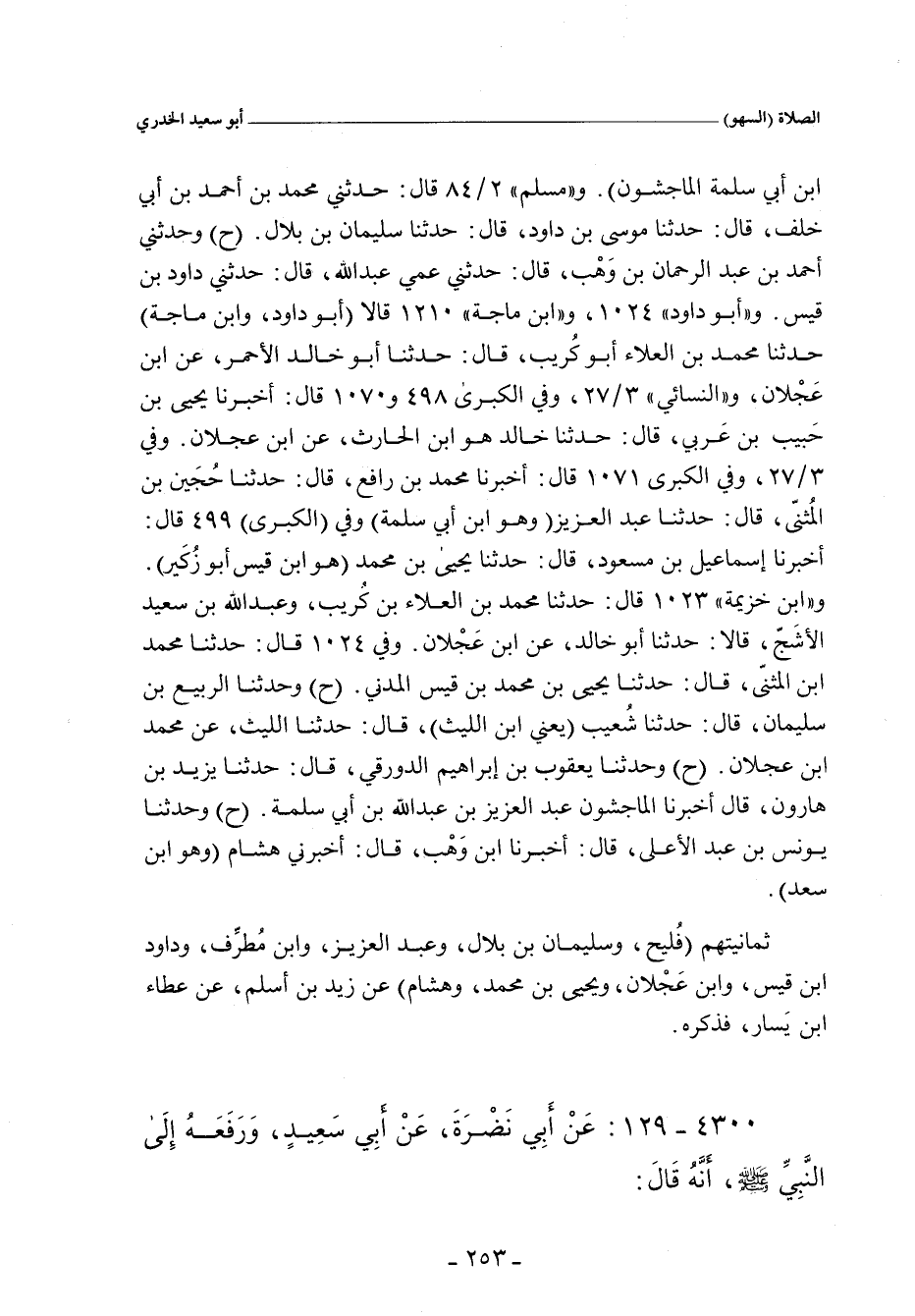 ابن أَبي سَلَمَة الماجشون. و"مسلم" ٢/ ٨٤ (١٢٠٩) قال: حدَّثني مُحَمد بن أحمد بن أَبي خلف، حدَّثنا مُوسَى بن داود، حدَّثنا سُلَيْمَان بن بِلَال. وفي ٢/ ٨٤ (١٢١٠) قال: حدَّثني أحمد بن عَبْد الرَّحْمان بن وَهْب، حدَّثني عَمّي عَبْد اللهِ، حدَّثني داود بن قَيْس. و"أبو داود" ١٠٢٤ قال: حدَّثنا مُحَمد بن العَلَاء، حدَّثنا أبو خالد، عن ابن عَجْلَان. و"ابن ماجة" ١٢١٠ قال: حدَّثنا أبو كُرَيْب، حدَّثنا أبو خالد الأَحْمَر، عن ابن عَجْلَان. و"النَّسائي" ٣/ ٢٧، وفي "الكبرى" ٥٨٨ و ١١٦٢ قال: أخبرنا يَحيى بن حَبِيب بن عَرَبِي. قال: حدَّثنا خالد، هو ابن الحارث، عن ابن عَجْلَان. وفي ٣/ ٢٧، وفي "الكبرى" ١١٦٣ قال: أخبرنا مُحَمد بن رافع. قال: حدَّثنا حُجَين بن المُثَنَّى. قال: حدَّثنا عَبْد العَزِيز، وهو ابن أَبي سَلَمَة. وفي "الكبرى" ٥٨٩ قال: أخبرنا إِسْمَاعِيل بن مَسعود. قال: حدَّثنا يَحيى بن مُحَمد، هو ابن قَيْس أبو زُكَير. و"ابن خزيمة" ١٠٢٣ قال: حدَّثنا مُحَمد بن العلا بن كُرَيْب، وعَبْد اللهِ بن سَعِيد الأشَج، قالا: حدَّثنا أبو خالد , عن ابن عَجْلَان. وفي (١٠٢٤) قال: حدَّثنا مُحَمد بن المُثَنَّى، حدَّثنا يَحيى بن مُحَمد بن قَيْس المَدَنِي (ح) وحدَّثنا االربيع بن سُلَيْمَان، حدَّثنا شُعَيْب، يَعْنِي ابن اللّيْث، حدَّثنا اللَّيْث، عن مُحَمد بن عَجْلَان (ح)