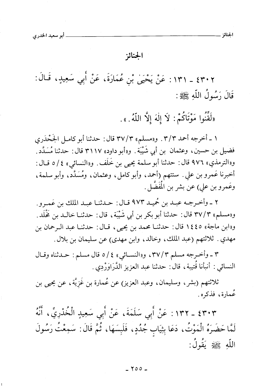 ٤٣٠٣ - عَنْ أَبِى سَلَمَةَ بن عبد الرحمن , عَنْ أَبِى سَعِيدٍ الْخُدْرِيِّ , أَنَّهُ لَمَّا حَضَرَهُ الْمَوْتُ , دَعَا بِثِيَابٍ جُدُدٍ , فَلَبِسَهَا , ثُمَّ قَالَ: سَمِعْتُ رَسُولَ اللَّهِ صلى الله عليه وسلم يَقُولُ: