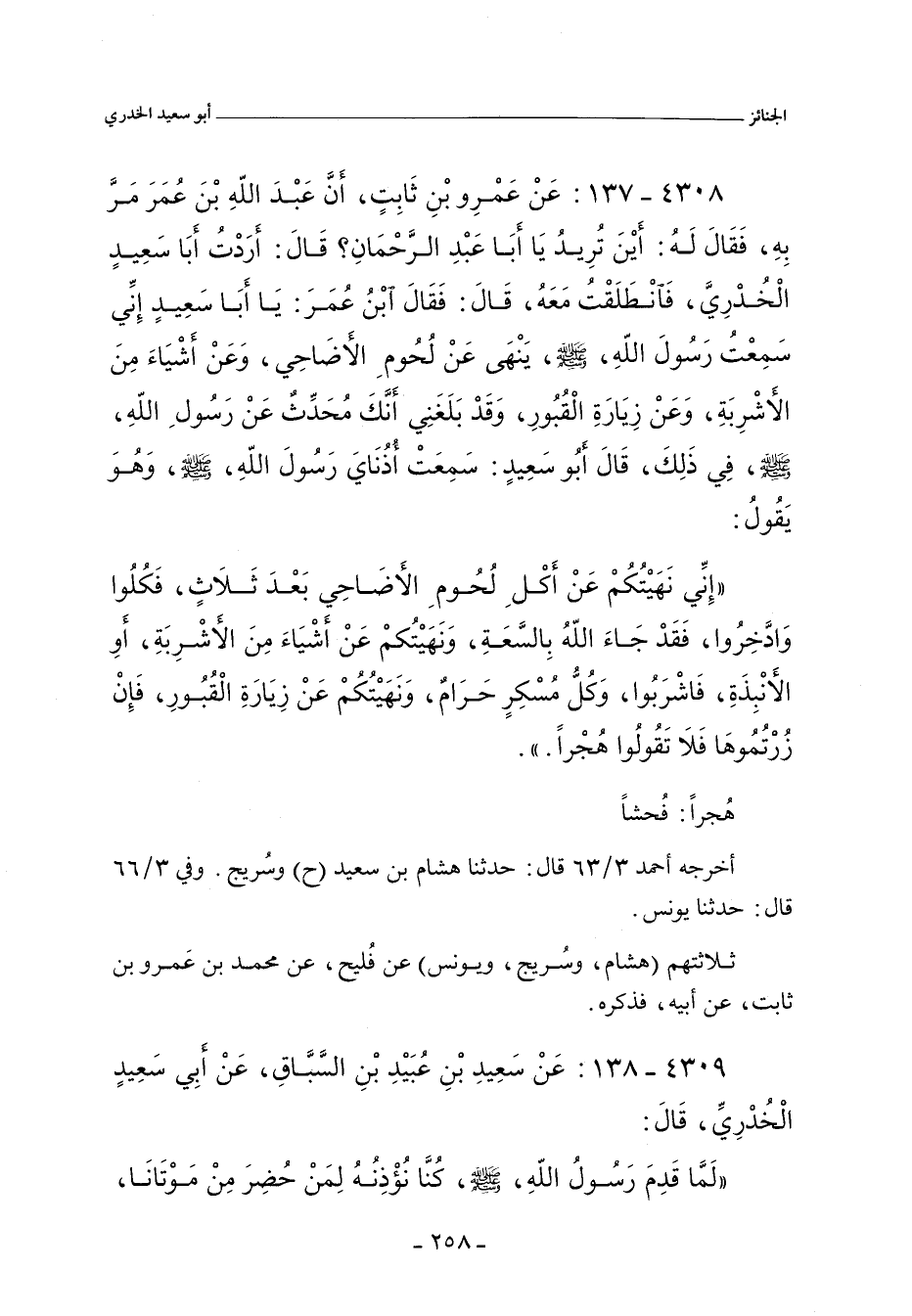 ٤٣٠٨ - عَنْ عَمْرِو بْنِ ثَابِتٍ , أَنَّ عَبْدَ اللَّهِ بْنَ عُمَرَ مَرَّ بِهِ فَقَالَ لَهُ: أَيْنَ تُرِيدُ يَا أَبَا عَبْدِ الرَّحْماَنِ؟ قَالَ: أَرَدْتُ أَبَا سَعِيدٍ الْخُدْرِىَّ , فَانْطَلَقْتُ مَعَهُ , قَالَ: فَقَالَ ابْنُ عُمَرَ: يَا أَبَا سَعِيدٍ , إِنِّى سَمِعْتُ رَسُولَ اللَّهِ صلى الله عليه وسلم , يَنْهَى عَنْ لُحُومِ الأَضَاحِىِّ , وَعَنْ أَشْيَاءَ مِنَ الأَشْرِبَةِ , وَعَنْ زِيَارَةِ الْقُبُورِ , وَقَدْ بَلَغَنِى أَنَّكَ مُحَدِّثٌ عَنْ رَسُولِ اللَّهِ , صلى الله عليه وسلم , فِى ذَلِكَ , قَالَ أَبُو سَعِيدٍ: سَمِعَتْ أُذُنَايَ رَسُولَ اللَّهِ , صلى الله عليه وسلم , وَهُوَ يَقُولُ: