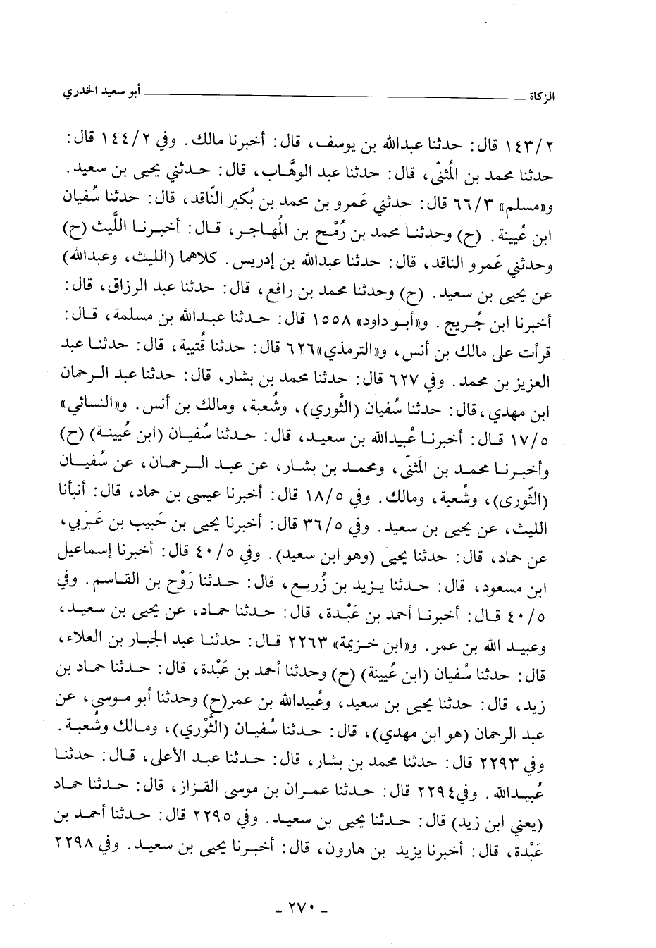 ٢/ ١٤٣ (١٤٤٧) قال: حدَّثنا عَبْد اللهِ بن يُوسُف، أخبرنا مالك. وفي ٢/ ١٤٤ (١٤٤٧ م) قال: حدَّثنا مُحَمد. بن المُثَنَّى، حدَّثنا عَبْد الوَهَّاب، قال: حدَّثني يَحيى بن سَعِيد. و"مسلم" ٣/ ٦٦ (٢٢٢٥) قال: حدَّثني عَمْرو بن مُحَمد بن بُكَيْر النَّاقِد، حدَّثنا سُفْيان بن عُيينة. وفي ٣/ ٦٦ (٢٢٢٦) قال: حدَّثنا مُحَمد بن رُمح بن المهاجر، أخبرنا اللَّيْث (ح) وحدَّثني عَمْرو النَّاقِد، حدَّثنا عَبْد اللهِ بن إِدْرِيس، كلاهما عن يَحيى بن سَعِيد. وفي ٣/ ٦٦ (٢٢٢٧) قال: حدَّثنا مُحَمد بن رافع، حدَّثنا عَبْد الرَّزَّاق، أخبرنا ابن جُرَيْج. و"أبو داود" ١٥٥٨ قال: حدَّثنا عَبْد اللهِ بن مَسْلَمَة، قال: قراْتُ على مالك بن أَنَس. والتِّرْمِذِيّ" ٦٢٦ قال: حدَّثنا قُتَيْبَة، حدَّثنا عَبْد العَزِيز بن مُحَمد. وفي (٦٢٧) قال: حدَّثنا مُحَمد بن بَشَّار، حدَّثنا عَبْد الرَّحْمان بن مَهْدِي، حدَّثنا سُفْيان، وشُعْبة، ومالك بن أَنَس. و"النَّسائي" ٥/ ١٧، وفي "الكبرى" ٢٢٣٧ قال: أخبرنا عُبَيْد الله بن سَعِيد. قال: حدَّثنا سُفْيان (ح) وأخبرنا مُحَمد بن المُثَنَّى، ومُحَمد بن بَشَّار، عن عَبْد الرَّحْمان، عن سُفْيان، وشُعْبة، ومالك. وفي ٥/ ١٨، وفي