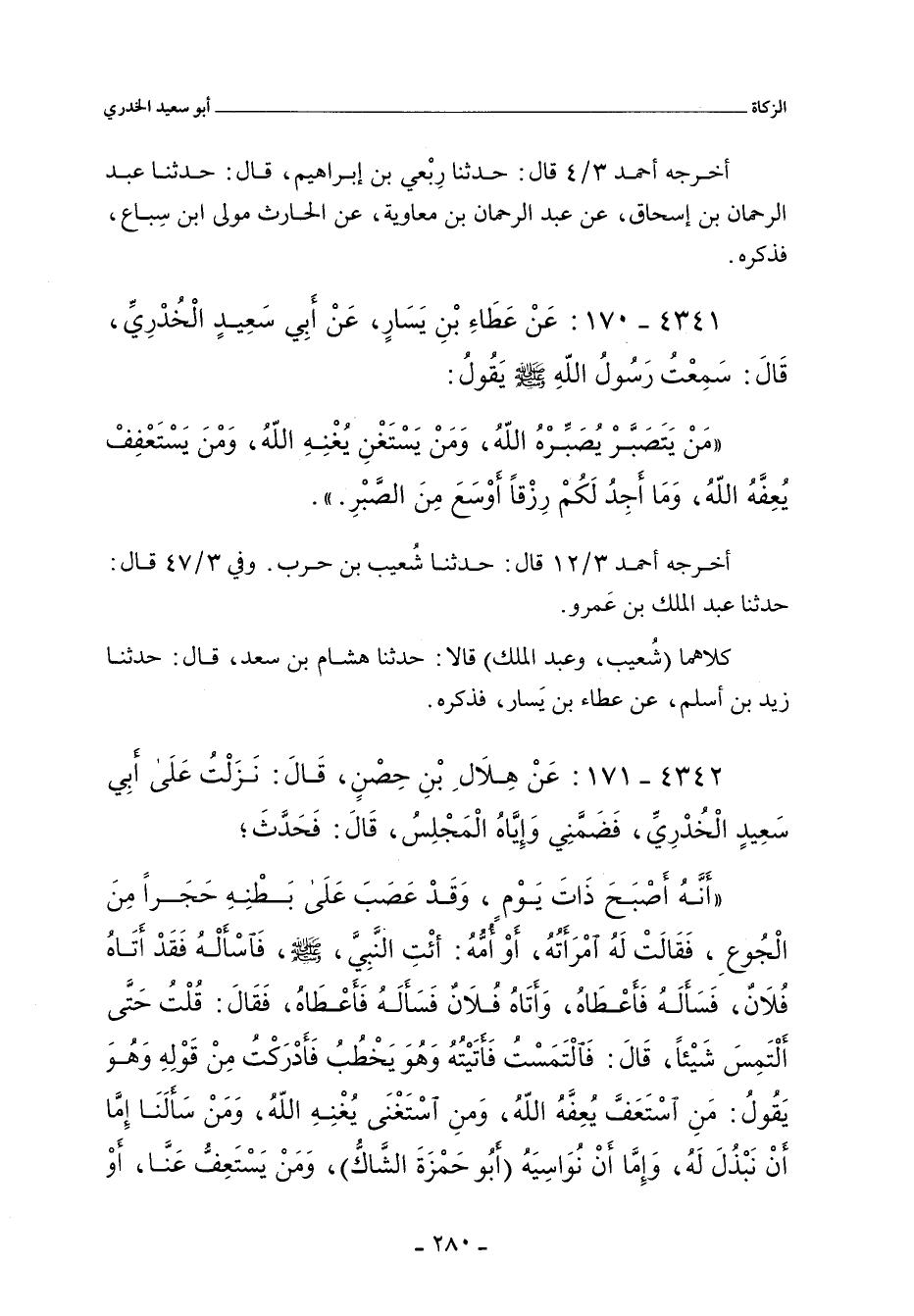 - وفي رواية: أَرْسَلَنِى أَهْلِى إِلَى رَسُولِ اللَّهِ , صلى الله عليه وسلم , أَسْأَلُهُ طَعَامًا , فَأَتَيْتُ النَّبِيَّ , صلى الله عليه وسلم , وَهُوَ يَخْطُبُ , فَسَمِعْتُهُ يَقُولُ: مَنْ يَصْبِرْ يُصَبِّرْهُ اللَّهُ , وَمَنْ يَسْتَغْنِ يُغْنِهِ اللَّهُ , وَمَنْ يَسْتَعْفِفْ يُعِفَّهُ اللَّهُ , وَمَا رُزِقَ الْعَبْدُ رِزْقًا أَوْسَعَ لَهُ مِنَ الصَّبْرِ.