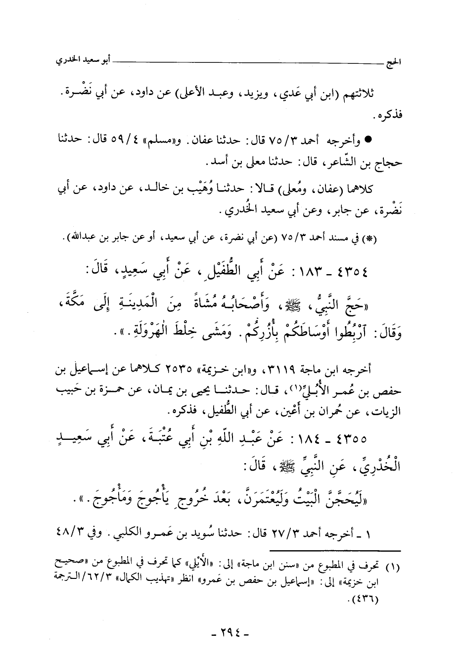 -وأخرجه مُسْلم ٤/ ٥٩ (٢٩٩٨ و ٢٩٩٩) قال: حدَّثنا حَجّاج بن الشاعر، حدَّثنا مُعَلى بن أَسَد،، حدَّثنا وُهَيْب بن خالد، عن داود، عن أَبي نَضْرَة، عَنْ جَابِرٍ، وَعَنْ أَبي سَعِيدٍ الْخُددرِيِّ، رَضِيَ الله عَنْهُمَا، قالا: