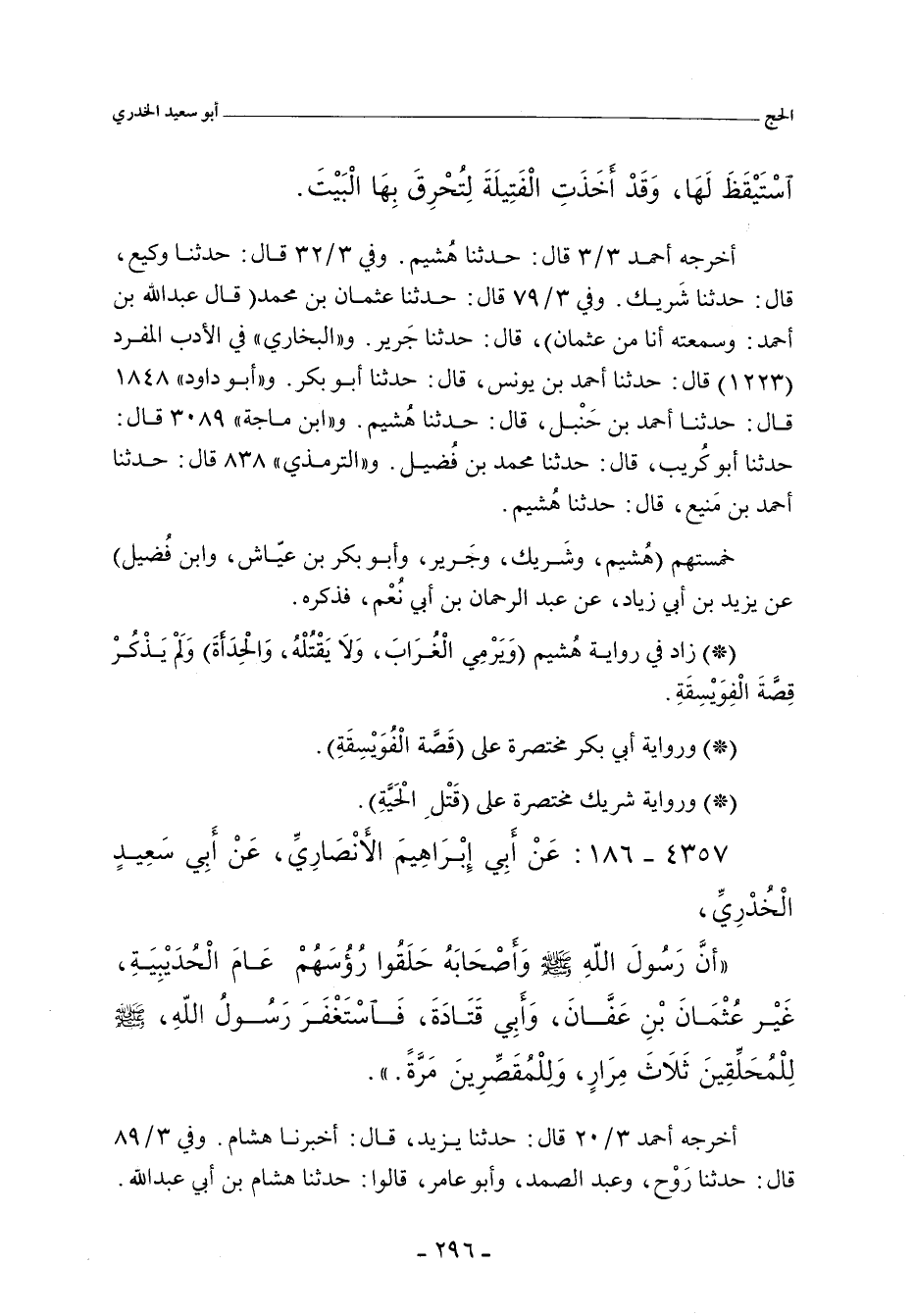 - وفي رواية: اَن اَلنبِيَّ صلى الله عليه وسلم حَلَقَ يَومَ الْحُدَيْبِيَةِ هُوَ وَأَصْحَابُهُ، إِلآَ عُثْمَانَ وَأبَا قتَادَة، فَقَالَ رَسُولُ الله صلى الله عليه وسلم: يَرْحَمُ الله الْمُحَلقِينَ. قَالُوا: وَالْمُقَصرِينَ؟ قَالَ: يَرْحَمُ الله الْمُحَلقِينَ. قَالُوا: وَاَلْمُقَصرينَ يَا رَسُولَ الله؟ قَالَ: يَرْحَمُ الله اَلْمُحَلقِينَ. قَالُوا: وَالْمُقَصًرِينَ يَا رَسُولَ الله؟ الْمقَصرِين.