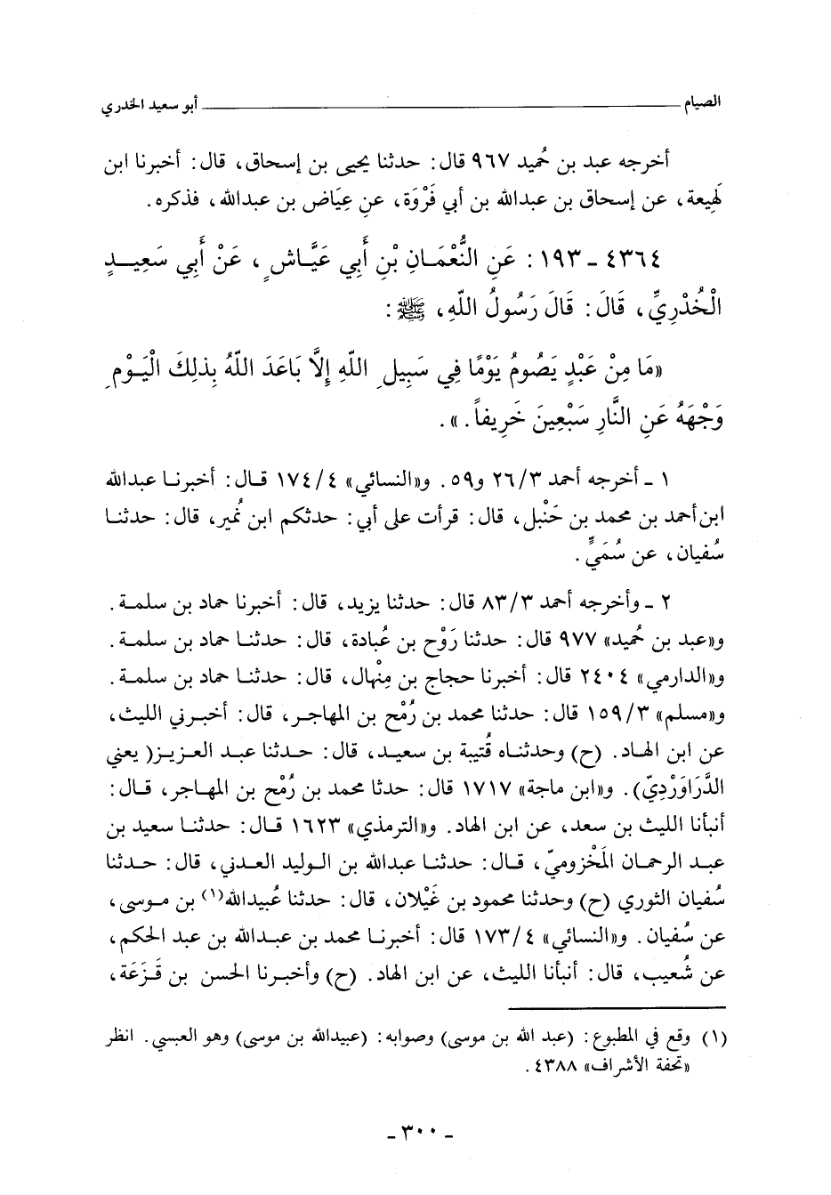 أخرجه أحمد ٣/ ٨٣ (١١٨١٢) قال: حدَّثنا يَزِيد , أنبأنا حمَّاد بن سَلَمَة، عن سُهَيْل بن أَبي صالح. و"عَبد بن حُميد" ٩٧٧ قال: حدَّثنا رَوْح بن عُبَادَة، حدَّثنا حَمَّاد بن سَلَمَة، حدَّثنا سُهَيْل بن أَبي صالح. و"الدارِمِي" ٢٣٩٩ قال: أخبرنا حَجَّاج بن منهال، حدَّثنا حَمَّاد بن سَلَمَة، عن سُهَيْل بن أَبي صالح. و"البُخَارِي" ٤/ ٣١ (٢٨٤٠) قال: حدَّثنا إِسْحَاق بن نَصْر , حدَّثنا عَبْد الرَّزَّاق , أخبرنا ابن جُريجَ، قال: أخبرني يَحيى بن سَعِيد، وسُهيل بن أَبي صالح. و"مسلم" ٣/ ١٥٩ (٢٦٨١) قال: حدَّثنا مُحَمد بن رمح بن المهاجر، أخبرني اللَّيْث، عن ابن الهاد , عن سُهَيْل بن أَبي صالح. وفي (٢٦٨٢) قال: وحدَّثناه قُتَيْبَة بن سَعِيد، حدَّثنا عَبْد العَزِيز، يَعْنِي االدراوَدِي، عن سُهَيْل. وفي (٢٦٨٣) قال: وحدَّثني إِسْحَاق بن مَنْصُور، وعَبْد الرَّحْمان بن بِشْر العَبْدِي. قالا: حدَّثنا عَبْد الرَّزَّاق، أخبرنا ابن جُرَيْج، عن يَحيى بن سَعِيد، وسهيل بن أَبي صالح. و"ابن ماجة" ١٧١٧ قال: حدَّثنا مُحَمد بن رُمْح بن المُهاجر، أنبأنا اللَّيْث بن سَعْد، عن ابن الهاد، عن سُهَيْل بن أَبي صالح. والتِّرْمِذِيّ" ١٦٢٣ قال: حدَّثنا سَعِيد بن عَبْد الرَّحْمان المَخزومي، حدَّثنا عَبْد اللهِ بن الوَلِيد العَدني، حدَّثنا سُفْيان الثَّوْرِي (ح) قال: وحدَّثنا محمود بن غَيْلَان، حدَّثنا عُبَيْد اللهِ بن مُوسَى، عن سُفْيان، عن سُهَيْل بن أَبي صالح. و"النَّسائي" ٤/ ١٧٣ , وفي "الكبرى" ٢٥٦٨ قال أخبرنا مُحَمد بن عَبْد اللهِ بن عَبْد الحَكَم، عن شُعَيْب. قال: أنبأنا اللَّيْث، عن ابن الهاد، عن سُهَيْل. وفي ٤/ ١٧٣ , وفي "الكبرى" ٢٥٦٩ قال: أخبرنا الحَسَن بن قزعة،