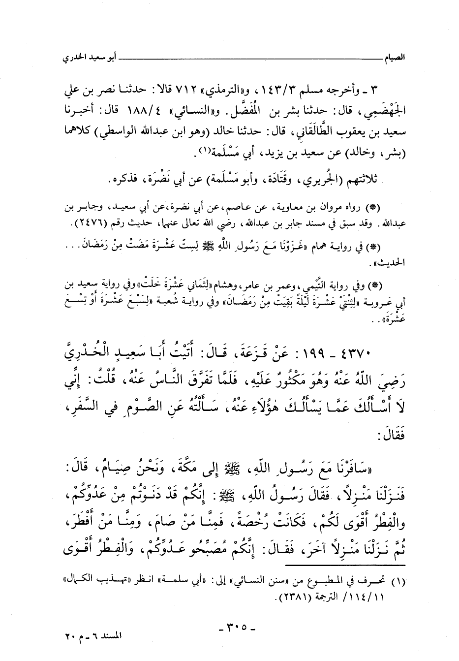 - رواه مَرْوَان بن مُعَاوِيَة، عن عاصم الأَحْوَل، عن أَبي نَضْرَة، عن أَبي سَعِيد، وجابر بن عَبْد اللهِ. وقد سبق في مسند جابر بن عَبْد اللهِ، رضي الله تعالى عنهما , حديث رقم (٢٩٠٦.
