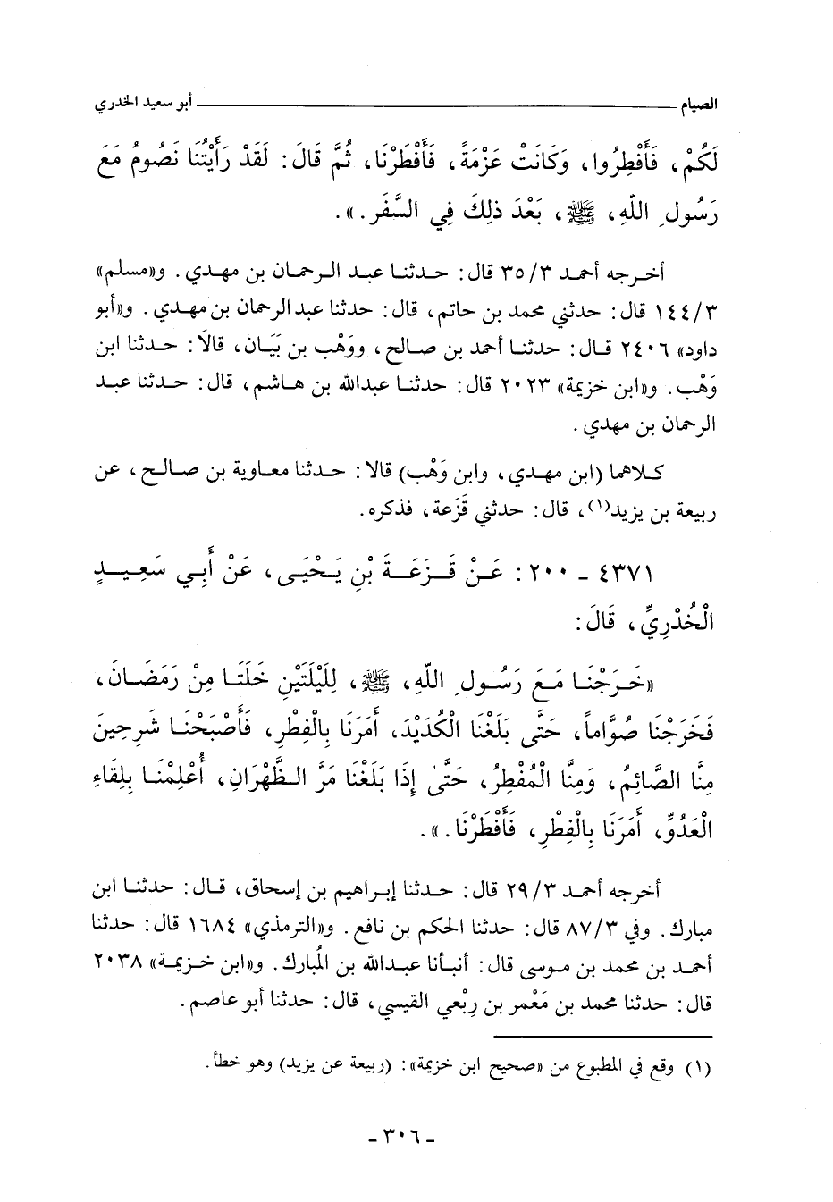 - لفظ زَيْد بن الحُبَاب: لسَأَلْتُ أَبَا سَعِيدٍ عَنِ اَلصوْمِ فِي اَلسفَرِ؟ فَقَالَ: سَافَرْنَا مَعَ رَسُولِ اللهِ صلى الله عليه وسلم، فَيَصُومُ وَنَصُومُ، حَتى نَزَلْنَا مَنزِلاً، فَقَالَ: إنَّكُمْ قَدْ دَنَوْتُمْ مِنْ عَدُوكُمْ، وَاَلْفِطْرُ أَقْوَى لَكُمْ.
