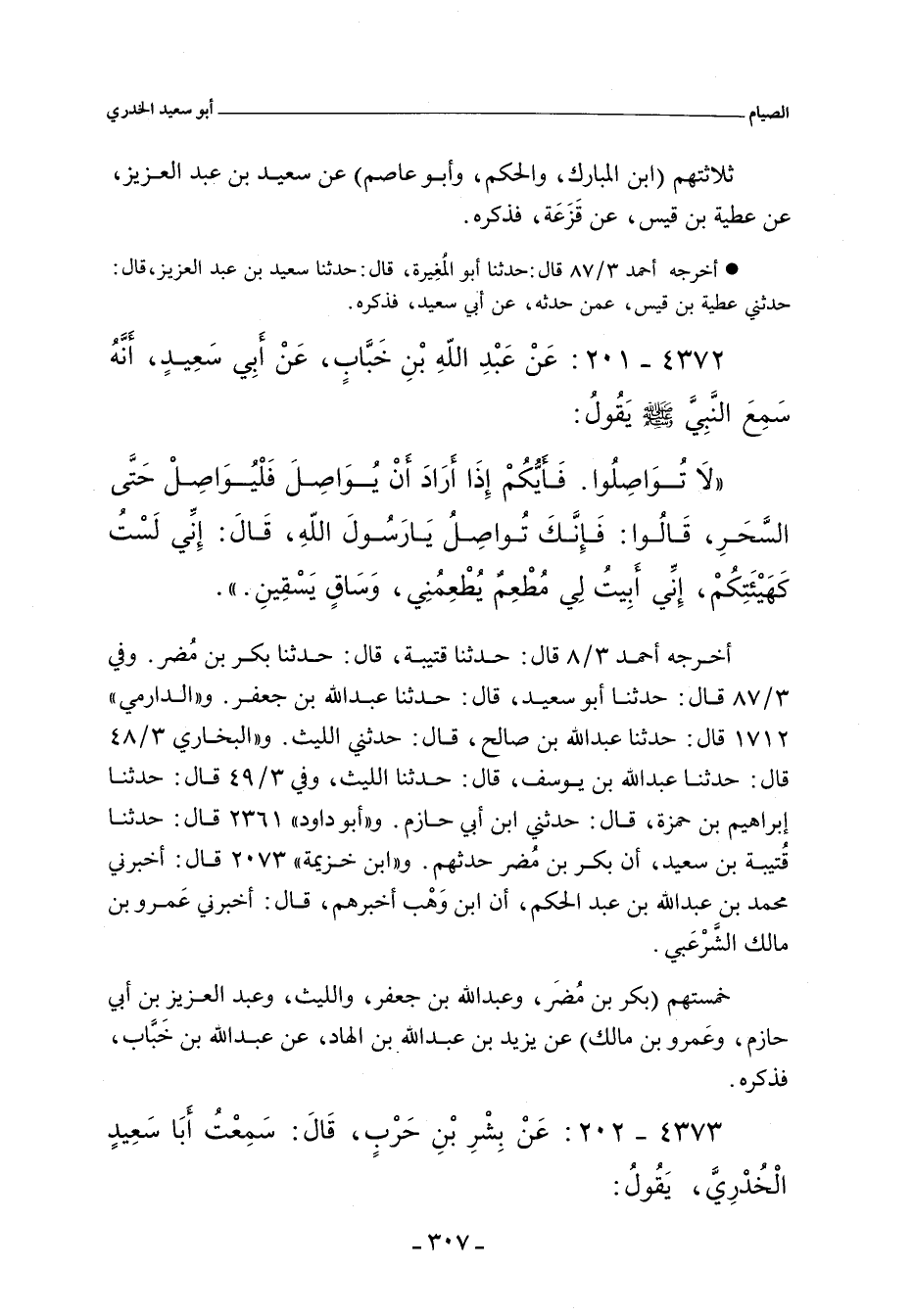 أخرجه أحمد ٣/ ٨ (١١٠٧٠) قال: حدَّثنا قُتَيْبَة، حدَّثنا بَكْر بن مُضَر. وفي ٣/ ٨٧ (١١٨٤٤) قال: حدَّثنا أبو سَعِيد، حدَّثنا عَبْد الله بن جَعْفَر. و"الدارِمِي" ١٧٠٥ قال: حدَّثنا عَبْد الله بن صالح، حدَّثني اللَّيْث. و"البُخَارِي" ٣/ ٤٨ (١٩٦٣) قال: حدَّثنا عَبْد الله بن يُوسُف، حدَّثنا اللَّيْث. وفي ٣/ ٤٩ (١٩٦٧) قال: حدَّثنا إبراهبم بن حَمْزَة، حدَّثني ابن أَبي حازم. و"أبو داود" ٢٣٦١ قال: حدَّثنا قُتَيْبَة بن سَعِيد، أن بَكْر بن مضر حدثهم. و"ابن خزيمة" ٢٠٧٣ قال: أخبرني مُحَمد بن عَبْد اللهِ بن عَبْد الحَكَم، أن ابن وَهْب أخبرهم، أخبرني عُمَر بن مالك الشَّرْعَبى.