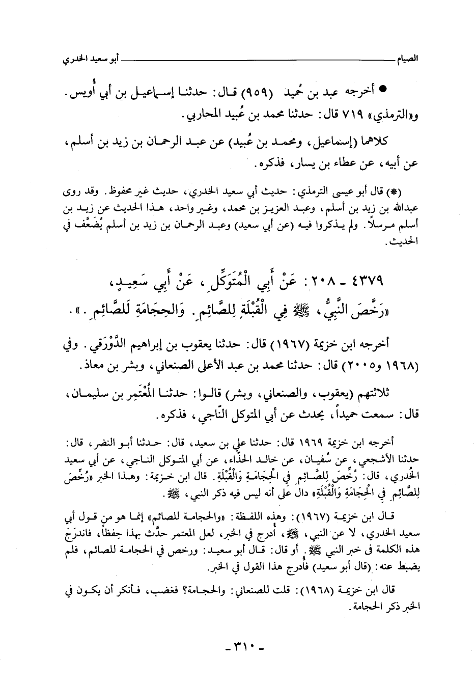 - وفي (٣٢٣٠) قال: أخبرنا زكريا بن بحيى. قال: حدَّثنا الحَسَن بن عِيسَى بن سرجس، قال: أخبرنا ابن المُبَارك. قال: أخبرنا خالد الحذاء، عن أَبي نَضْرَة، عن أَبي سَعِيد؛ أنه كان لا يرى بالحجامة لِلصائم بأسًا.