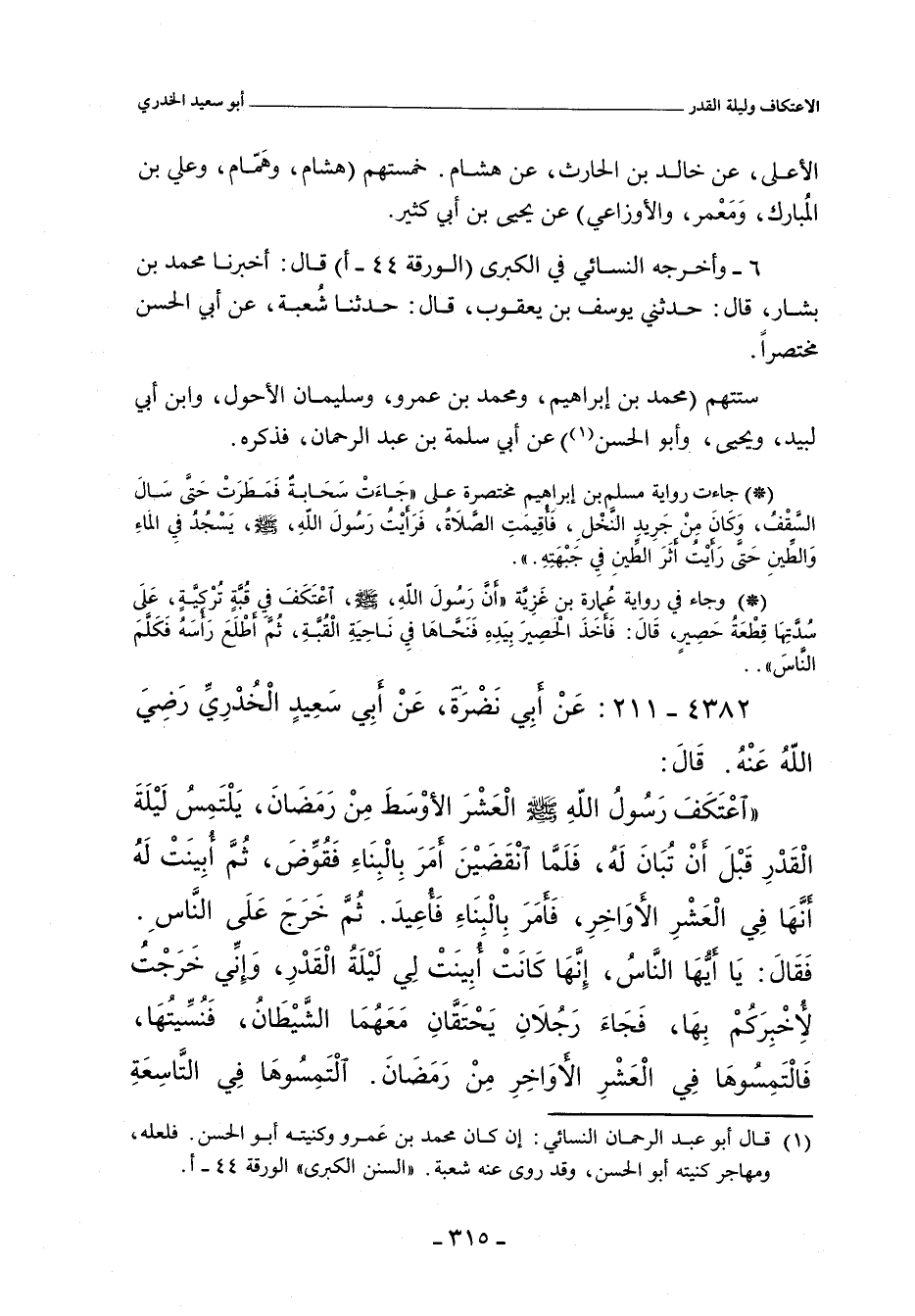 اعْتَكَفَ رَسُولُ اللهِ صلى الله عليه وسلم الْعَشْرَ الأَوْسَطَ مِنْ رَمَضَانَ، يَلْتَمِسُ لَيْلَةَ الْقَدْرِ قَبْلَ أَنْ تُبَانَ، لَهُ فَلَمَّا انْقَضَيْنَ أَمَرَ بِالْبِنَاءِ فَقُوِّضَ، ثُمَّ أُبِينَتْ لَهُ أَنَّهَا فِى الْعَشْرِ الأَوَاخِرِ، فَأَمَرَ بِالْبِنَاءِ فَأُعِيدَ، ثُمَّ خَرَجَ عَلَى النَّاسِ، فَقَالَ: يَا أَيُّهَا النَّاسُ، إِنَّهَا كَانَتْ أُبِينَتْ لِى لَيْلَةُ الْقَدْرِ، وَإِنِّى خَرَجْتُ لأُخْبِرَكُمْ بِهَا، فَجَاءَ رَجُلَانِ يَحْتَقَّانِ، مَعَهُمَا الشَّيْطَانُ فَنُسِّيتُهَا، فَالْتَمِسُوهَا فِى الْعَشْرِ الأَوَاخِرِ مِنْ رَمَضَانَ الْتَمِسُوهَا فِى التَّاسِعَةِ،