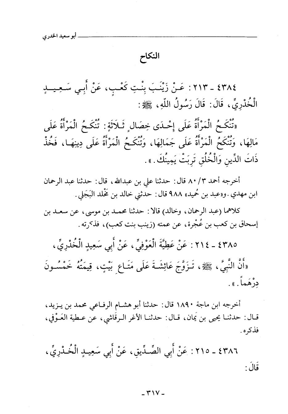 ٤٣٨٤ - عَنْ زَيْنَبَ بِنْتِ كَعْبٍ، عَنْ أَبي سَعِيدِ الْخُدْرِيِّ، قَالَ: قَالَ رَسُولُ الله صلى الله عليه وسلم: