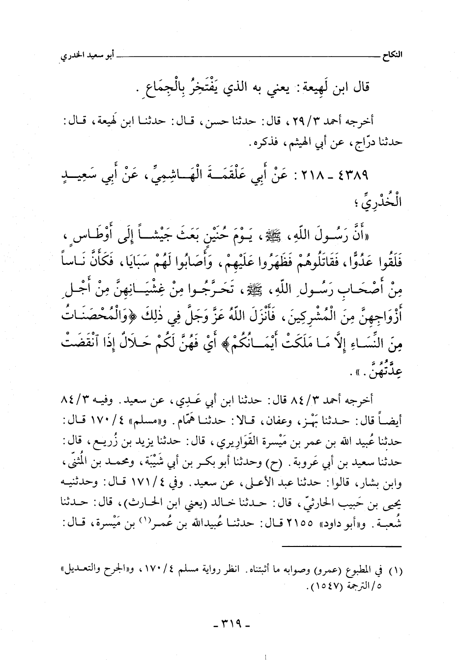 أَنَّ رَسُولَ اللهِ، صلى الله عليه وسلم، يَوْمَ حُنَيْنٍ، بَعَثَ جَيْشًا إِلَى أَوْطَاسٍ، فَلَقُوا عَدُوًّا، فَقَاتَلُوهُمْ فَظَهَرُوا عَلَيْهِمْ، وَأَصَابُوا لَهُمْ سَبَايَا، فَكَأَنَّ نَاسًا مِنْ أَصْحَابِ رَسُولِ اللهِ، صلى الله عليه وسلم، تَحَرَّجُوا مِنْ غِشْيَانِهِنَّ مِنْ أَجْلِ أَزْوَاجِهِنَّ مِنَ الْمُشْرِكِينَ، فَأَنْزَلَ اللهُ، عَزَّ وَجَلَّ، فِى ذَلِكَ: (وَالْمُحْصَنَاتُ مِنَ النِّسَاءِ إِلَاّ مَا مَلَكَتْ أَيْمَانُكُمْ) أَىْ فَهُنَّ لَكُمْ حَلَالٌ إِذَا انْقَضَتْ عِدَّتُهُنَّ.