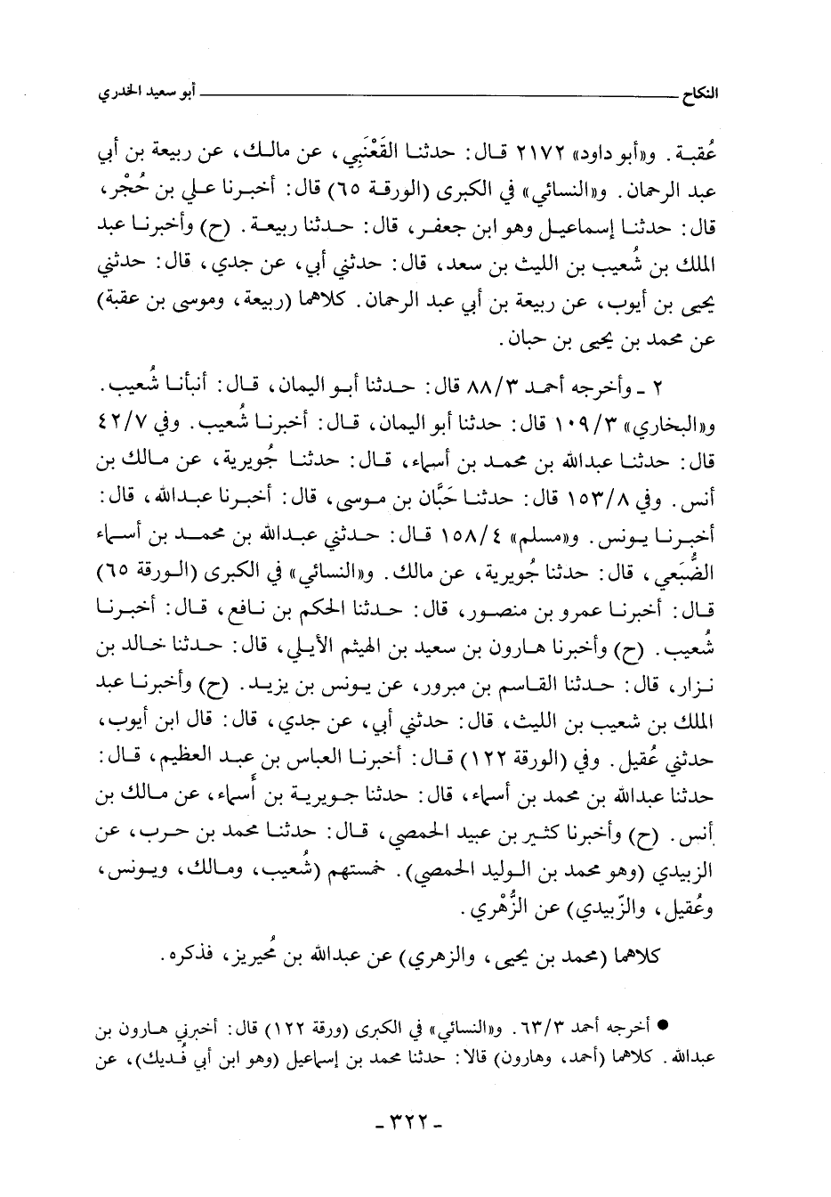 ٢ - وأخرجه أحمد ٣/ ٨٨ (١١٨٦١) قال: حدَّثنا أبو اليمان، أنبأنا شُعَيْب. و"البُخَارِي" ٣/ ١٠٩ (٢٢٢٩) قال: حدَّثنا أبو اليمان، أخبرنا شُعَيْب. وفي ٧/ ٤٢ (٥٢١٠) قال: حدَّثنا عَبْد اللهِ بن مُحَمد بن أسماء , حدَّثنا جُويرية، عن مالك بن أَنَس. وفي ٨/ ١٥٣ (٦٦٠٣) قال: حدَّثنا حَبان بن مُوسَى، أخبرنا عَبْد اللهِ، أخبرنا يُونُس. و"مسلم" ٤/ ١٥٨ (٣٥٣٦) قال: حدَّثني عَبْد اللهِ بن مُحَمد بن أسماء الضبعي، حدَّثنا جُويرية، عن مالك. و"النَّسائي"، في "الكبرى" ٥٠٢٤ قال: أخبرنا عَمْرو بن مَنْصُور، قال: حدثثا الحَكَم بن نافع، قال: أخبرنا شُعَيْب. وفي (٥٠٢٥) قال: أخبرنا هارون بن سَعِيد بن الهَيْثَم الأَيْلِي، قال: حدَّثني خالد بن نزار، قال: حدَّثني القاسم بن مَبرور، عن يُونُس بن يَزِيد. وفي (٥٠٢٨) قال: أخبرنا عَبْد الملك بن شُعَيْب بن الليْث، قال حدثني أبي , عن جدي , قال ابن أيوب: حدثني عُقيل. وفي (٩٠٤٠) قال: أخبرنا العَبَّاس بن عَبْد العظيم. قال: حدَّثنا عَبْد الله بن مُحَمد بن أسماء. قال: حدَّثنا جُويرية بن أسماء، عن مالك بن أَنَس. وفي (٩٠٣٩) قال: أخبرنا كَثِير بن عُبَيْد الحِمْصي. قال: حدَّثنا مُحَمد بن حَزب، عن الزُبَيدي، وهو مُحَمد بن الوَلِيد الحِمصي. خمستهم (شُعَيْب، ومالك، ويُونُس، وعُقَيل، والزُّبَيدي) عن ابن شِهَاب الزُّهري.