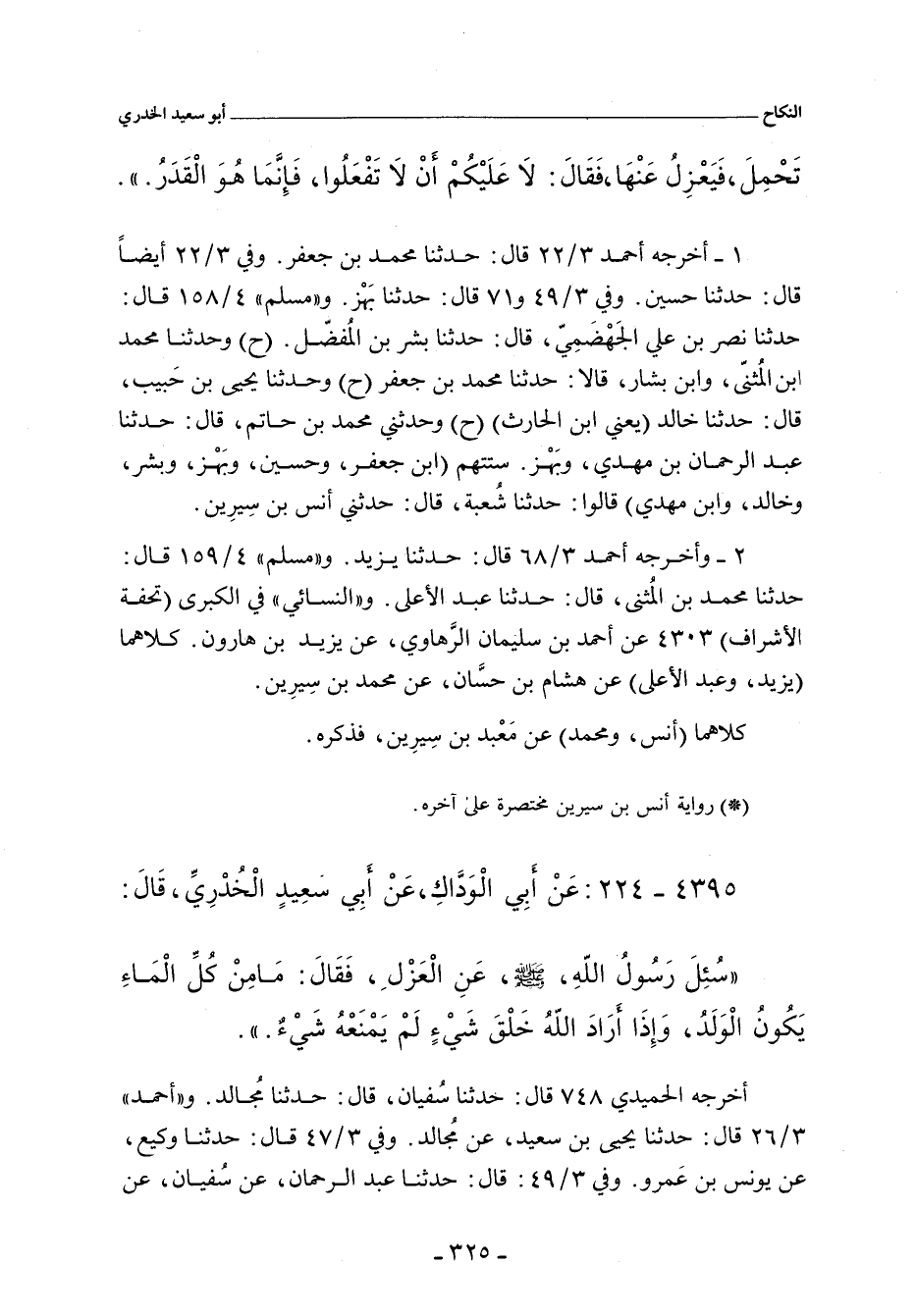 - وفي رواية: أَصَبْنَا سَبْيًا يَوْمَ حُنَيْنٍ، فَجَعَلْنَا نَعْزِلُ عَنْهُمْ، وَنَحْنُ نُرِيدُ الْفِدَاءَ، فَقَالَ بَعْضُنَا لِبَعْضٍ: تَفْعَلُونَ ذَلِكَ وَفِيكُمْ رَسُولُ اللهِ صلى الله عليه وسلم؟ فَسَأَلْتُ رَسُولُ اللهِ صلى الله عليه وسلم. فَقَالَ: لَيْسَ مِنْ كُلِّ الْمَاءِ يَكُونُ الْوَلَدُ، إِذَا أَرَادَ اللهُ أَنْ يَخْلُقَ شَيْئًا لَمْ يَمْنَعْهُ شَىْءٌ.
