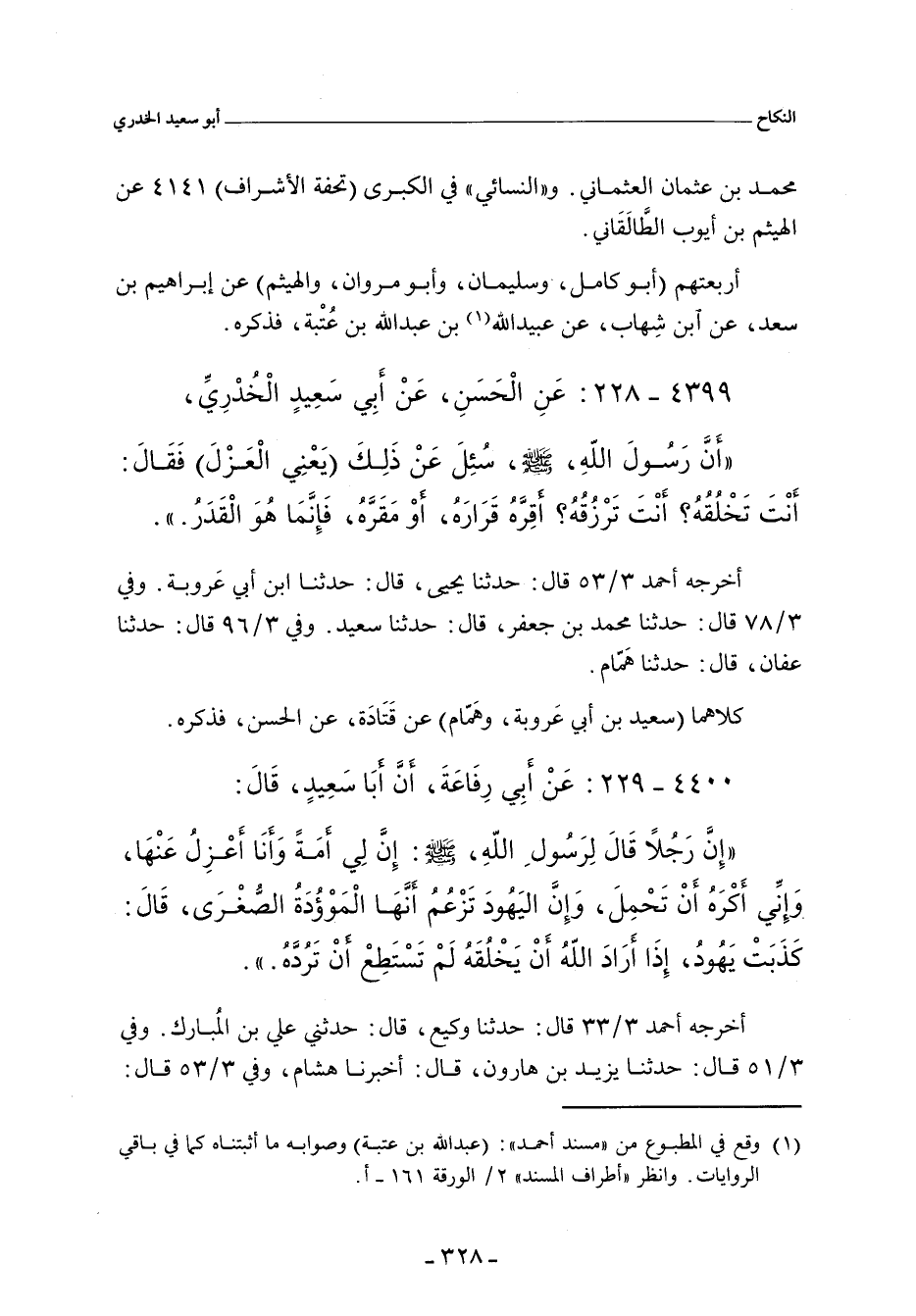 - زاد في رواية زحمويه: وكان عُمَر، وابن عُمَر , يكرهان العزل , وكان زَيْد , وابن مسعود , يعزلان.