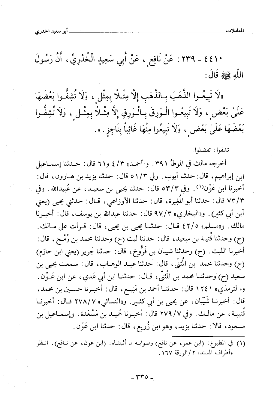 لَا تَبِيعُوا الذَّهَبَ بِالذَّهَبِ إِلَاّ مِثْلاً بِمِثْلٍ، وَلَا تُشِفُّوا بَعْضَهَا عَلَى بَعْضٍ، وَلَا تَبِيعُوا الْوَرِقَ بِالْوَرِقِ إِلَاّ مِثْلاً بِمِثْلٍ، وَلَا تُشِفُّوا بَعْضَهَا عَلَى بَعْضٍ، وَلَا تَبِيعُوا مِنْهَا غَائِبًا بِنَاجِزٍ.