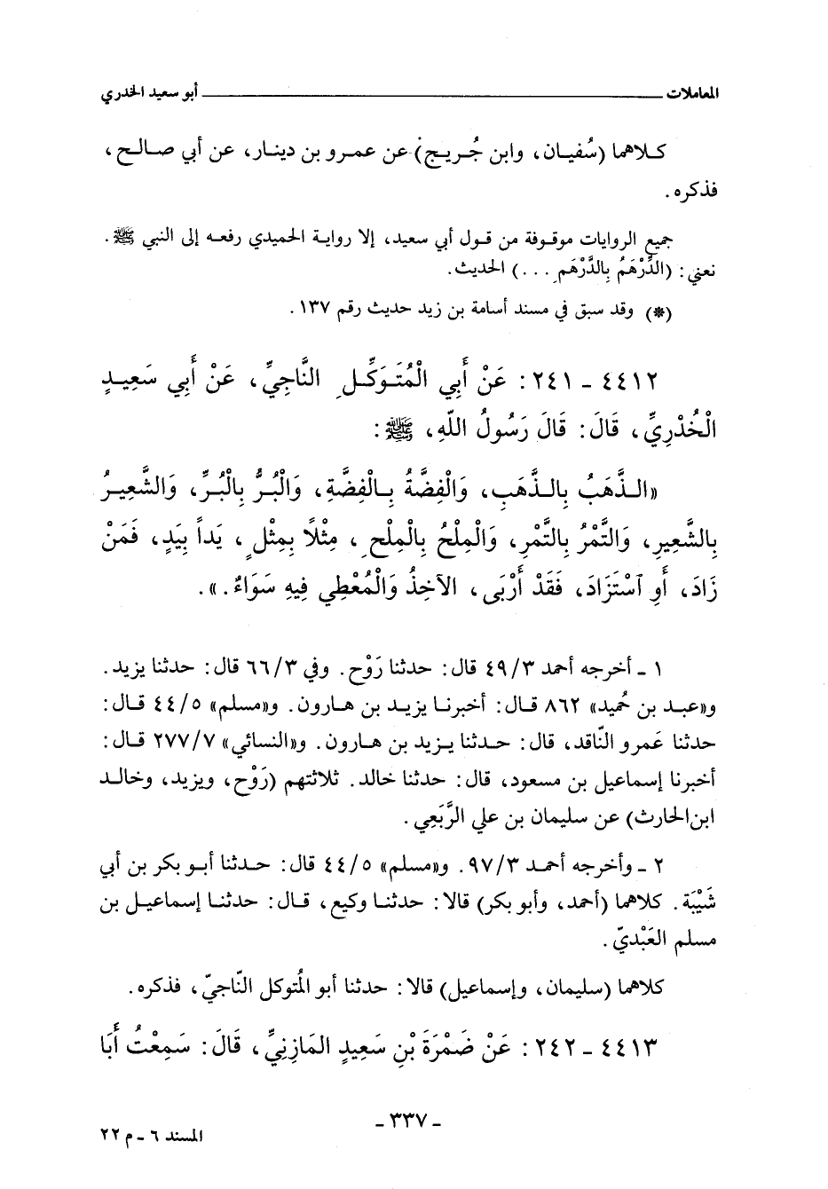 - وفي رواية خالد، عن سُلَيْمَان بن علي: أن أبا المُتَوَكِّل مر بهم في السوق، فقام إليه قوم أنا منهم، قال: قلنا أَتيناكَ لنسألكَ عن الصرفِ؟ قال: سمعتُ أَبا سَعيد الْخُدري. قال: له رجل: ما بينك وبينَ رسُولِ الله صلى الله عليه وسلم غيرُ أَبي سعيدٍ اَلخُدري؟ قال: ليس بيني وبينه غيره.