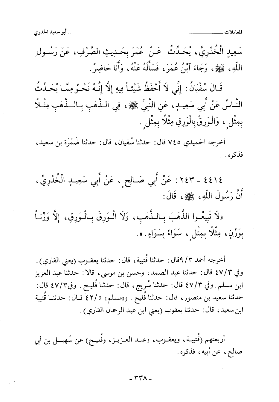 لَا تَبِيعُوا الذَّهَبَ بِالذَّهَبِ وَلَا الْوَرِقَ بِالْوَرِقِ إِلَاّ وَزْنًا بِوَزْنٍ مِثْلاً بِمِثْلٍ سَوَاءً بِسَوَاءٍ.