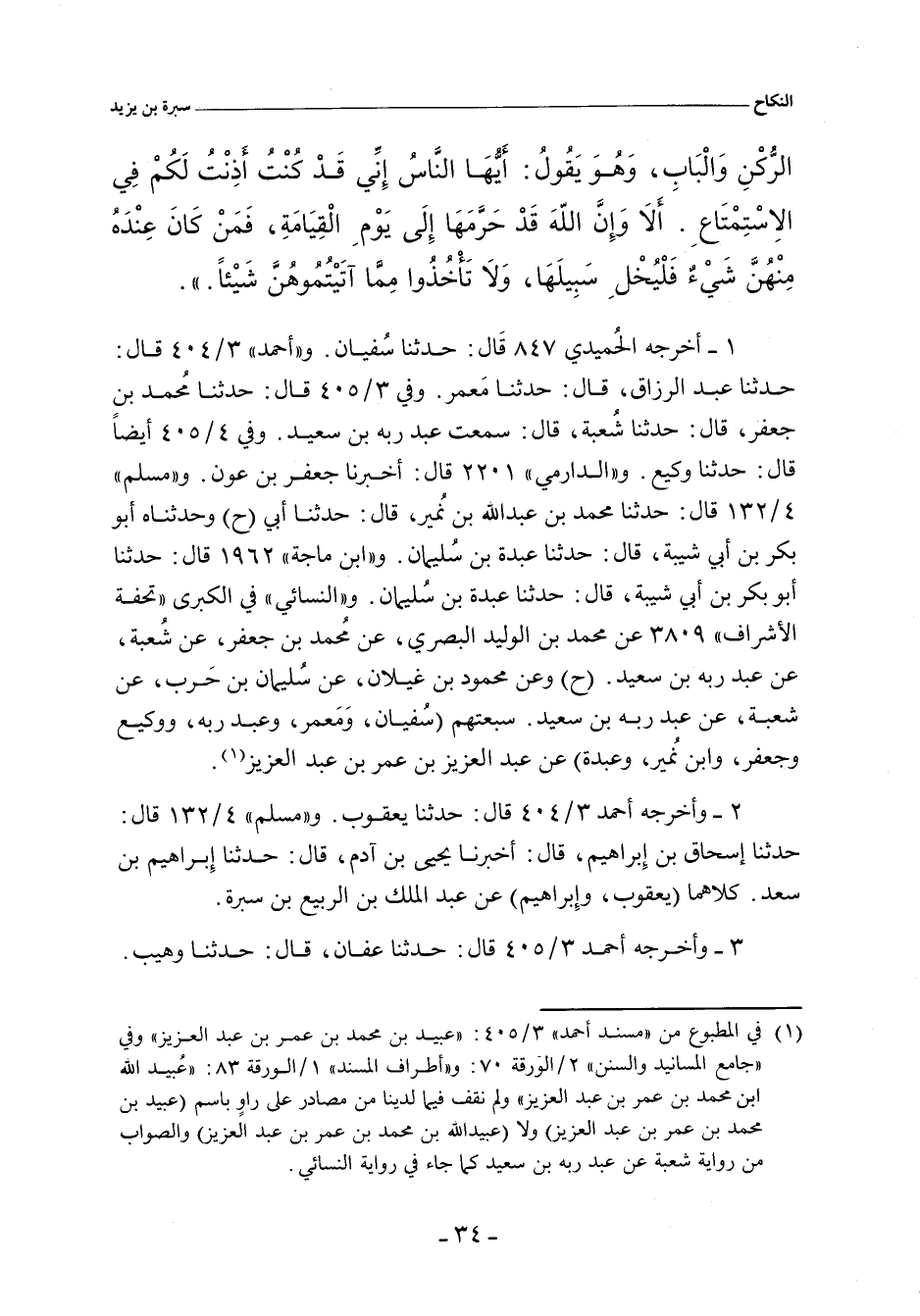 - وفي رواية: خَرَجْنَا مَعَ رَسُولِ اللهِ صلى الله عليه وسلم، فَلَمَّا قَضَيْنَا عُمْرَتَنَا، قَالَ لَنَا رَسُولُ اللهِ صلى الله عليه وسلم: اسْتَمْتِعُوا مِنْ هَذِهِ النِّسَاءِ، قَالَ: وَالاسْتِمْتَاعُ عِنْدَنَا يَوْمُ التَّزْوِيجِ، قَالَ: فَعَرَضْنَا ذَلِكَ عَلَى النِّسَاءِ، فَأَبَيْنَ إِلَاّ أَنْ يُضْرَبَ بَيْنَنَا وَبَيْنَهُنَّ أَجَلاً، قَالَ: فَذَكَرْنَا ذَلِكَ لِلنَّبِيِّ صلى الله عليه وسلم، فَقَالَ: افْعَلُوا، قَالَ: فَانْطَلَقْتُ أَنَا وَابْنُ عَمٍّ لِي، وَمَعَهُ بُرْدَةٌ، وَمَعِي بُرْدَةٌ، وَبُرْدَتُهُ أَجْوَدُ مِنْ بُرْدَتِي، وَأَنَا أَشَبُّ مِنْهُ، فَأَتَيْنَا امْرَأَةً، فَعَرَضْنَا ذَلِكَ عَلَيْهَا، فَأَعْجَبَهَا شَبَابِي، وَأَعْجَبَهَا بُرْدُ ابْنِ عَمِّي، فَقَالَتْ: بُرْدٌ كَبُرْدٍ، قَالَ: فَتَزَوَّجْتُهَا، فَكَانَ الأَجَلُ بَيْنِي وَبَيْنَهَا عَشْرًا، قَالَ: فَبِتُّ عِنْدَهَا تِلْكَ اللَّيْلَةَ، ثُمَّ أَصْبَحْتُ غَادِيًا إِلَى الْمَسْجِدِ، فَإِذَا رَسُولُ اللهِ صلى الله عليه وسلم بَيْنَ الْبَابِ وَالْحَِجَْرِ، يَخْطُبُ النَّاسَ، يَقُولُ: أَلَا أَيُّهَا النَّاسُ، قَدْ كُنْتُ أَذِنْتُ لَكُمْ فِي الاِسْتِمْتَاعِ مِنْ هَذِهِ النِّسَاءِ، أَلَا وَإِنَّ اللهَ، تَبَارَكَ وَتَعَالَى، قَدْ حَرَّمَ ذَلِكَ إِلَى يَوْمِ الْقِيَامَةِ، فَمَنْ كَانَ عِنْدَهُ مِنْهُنَّ شَيْءٌ، فَلْيُخَلِّ سَبِيلَهَا، وَلَا تَأْخُذُوا مِمَّا آتَيْتُمُوهُنَّ شَيْئًا.